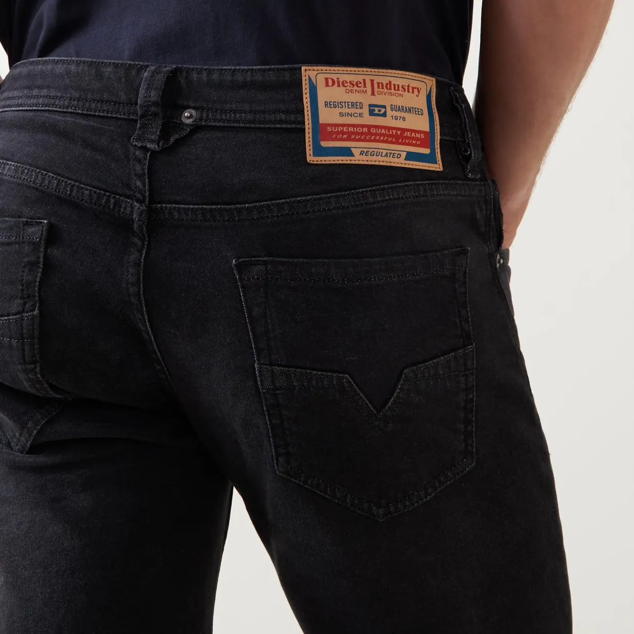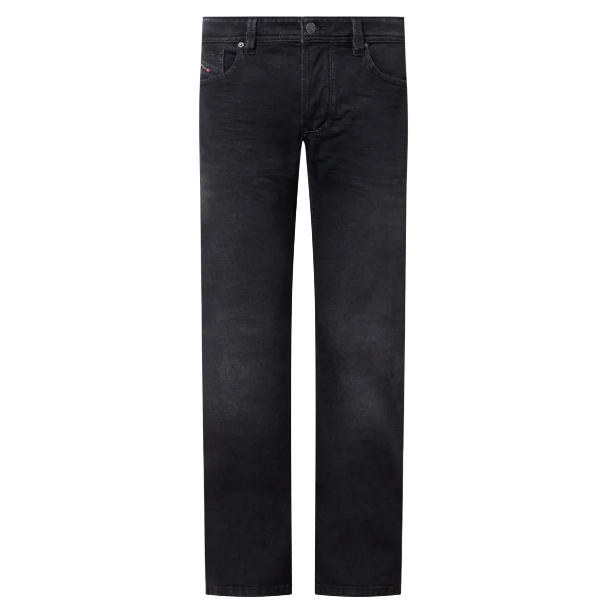 - Zip-fly and button fastening, belt loops, five-pocket design, tonal stitching, rear logo patch, whiskering and faded detailing, mid-rise, straight-cut leg, smooth denim finish