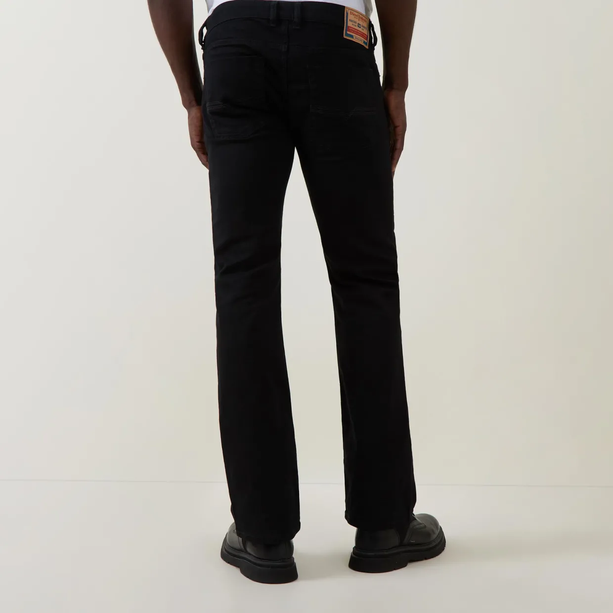 - Button and fly zip fastening, belt loops, five-pocket style, logo details, bootcut finish