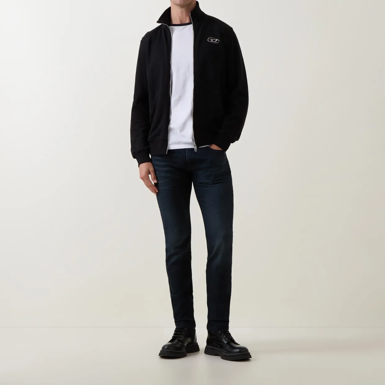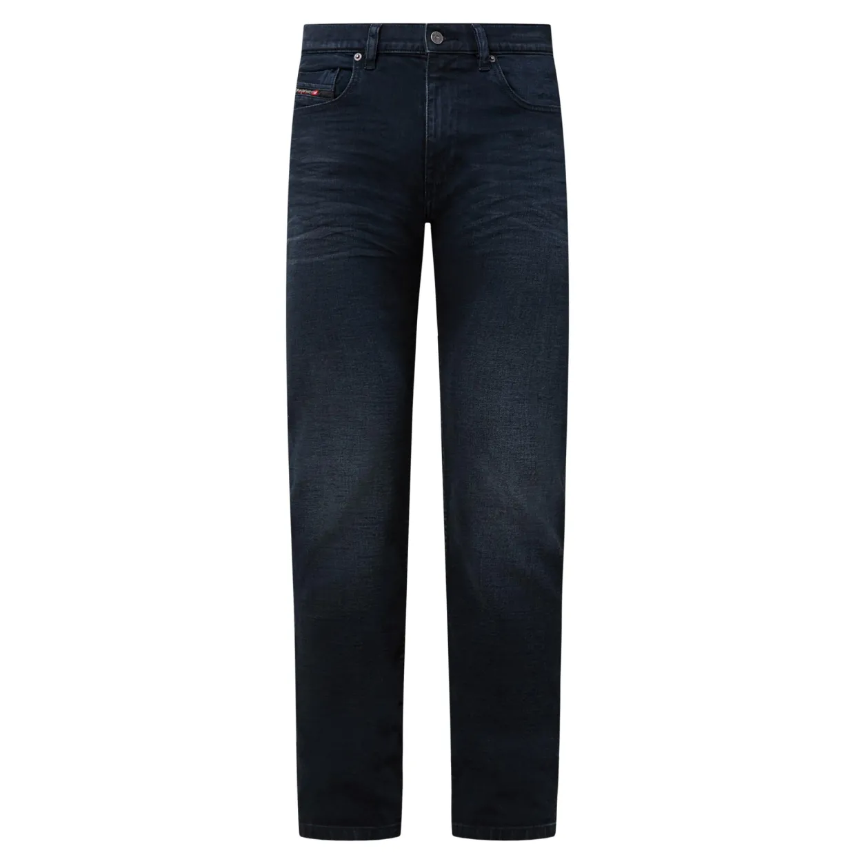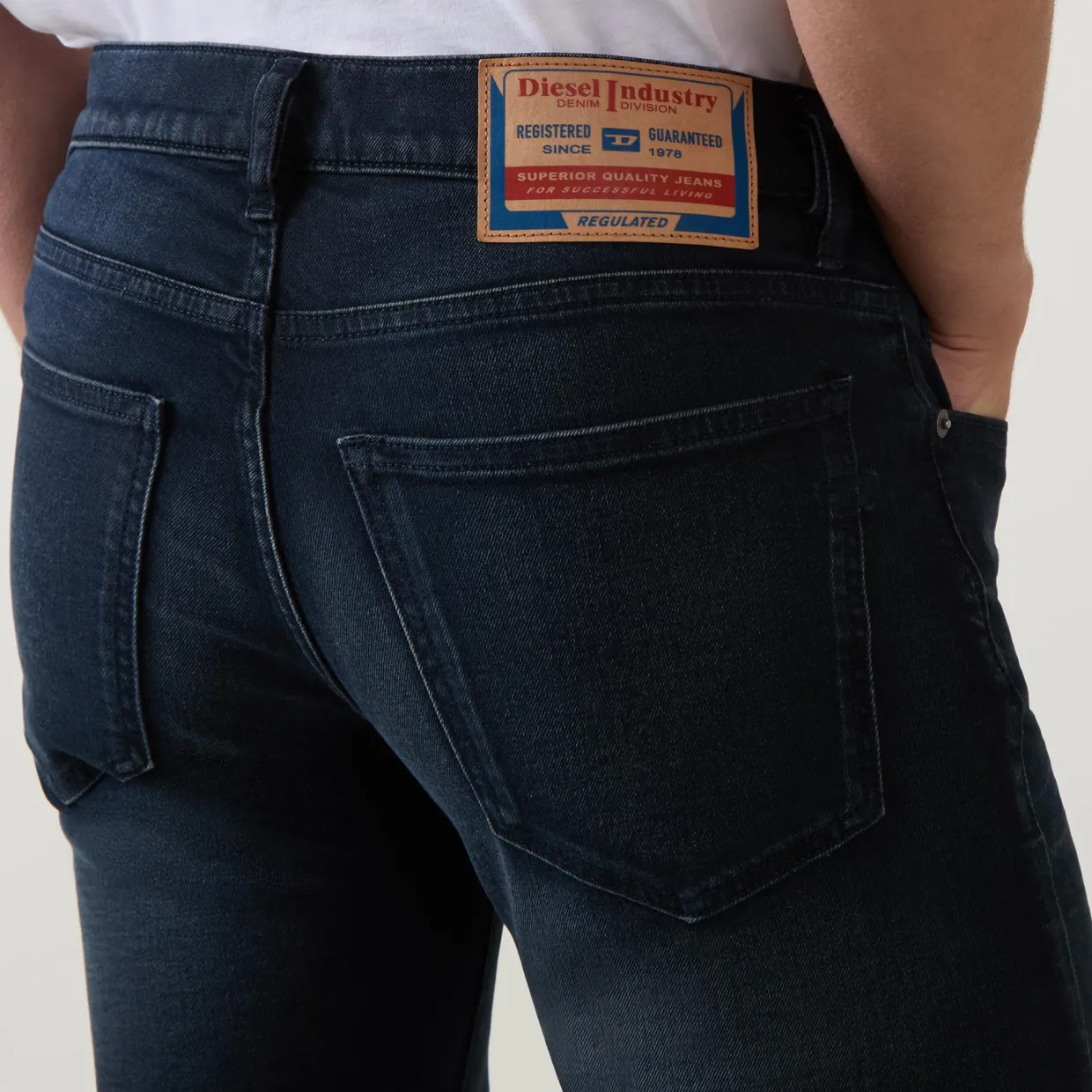 - Zip-fly and button fastening, belt loops, five-pocket design, tonal stitching, rear logo patch, whiskering, mid-rise, slim-cut leg, smooth denim finish