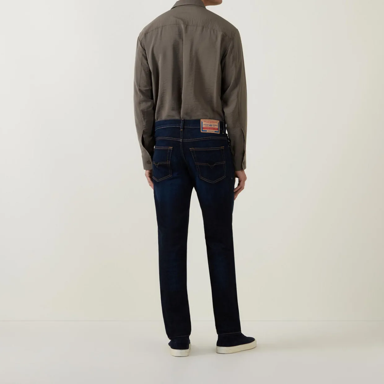 - Tapered leg, mid-rise, belt loops, zip and button fastening, whisker detail, faded wash, five pockets