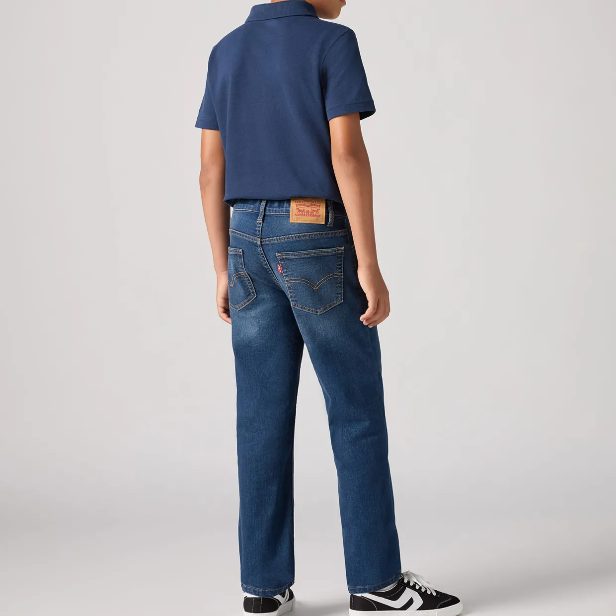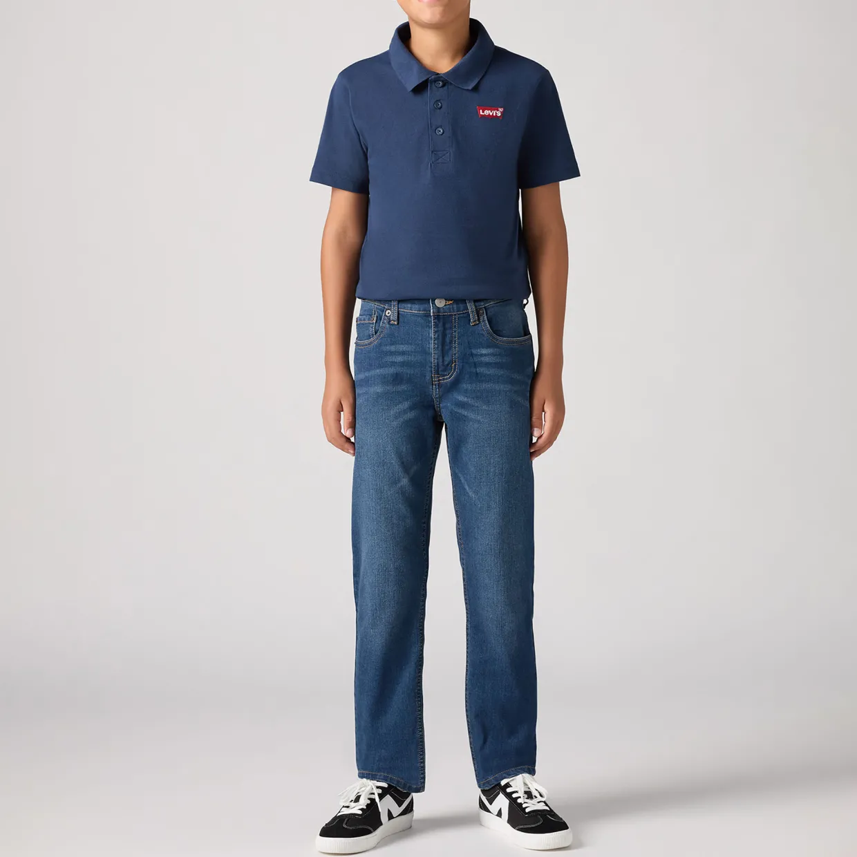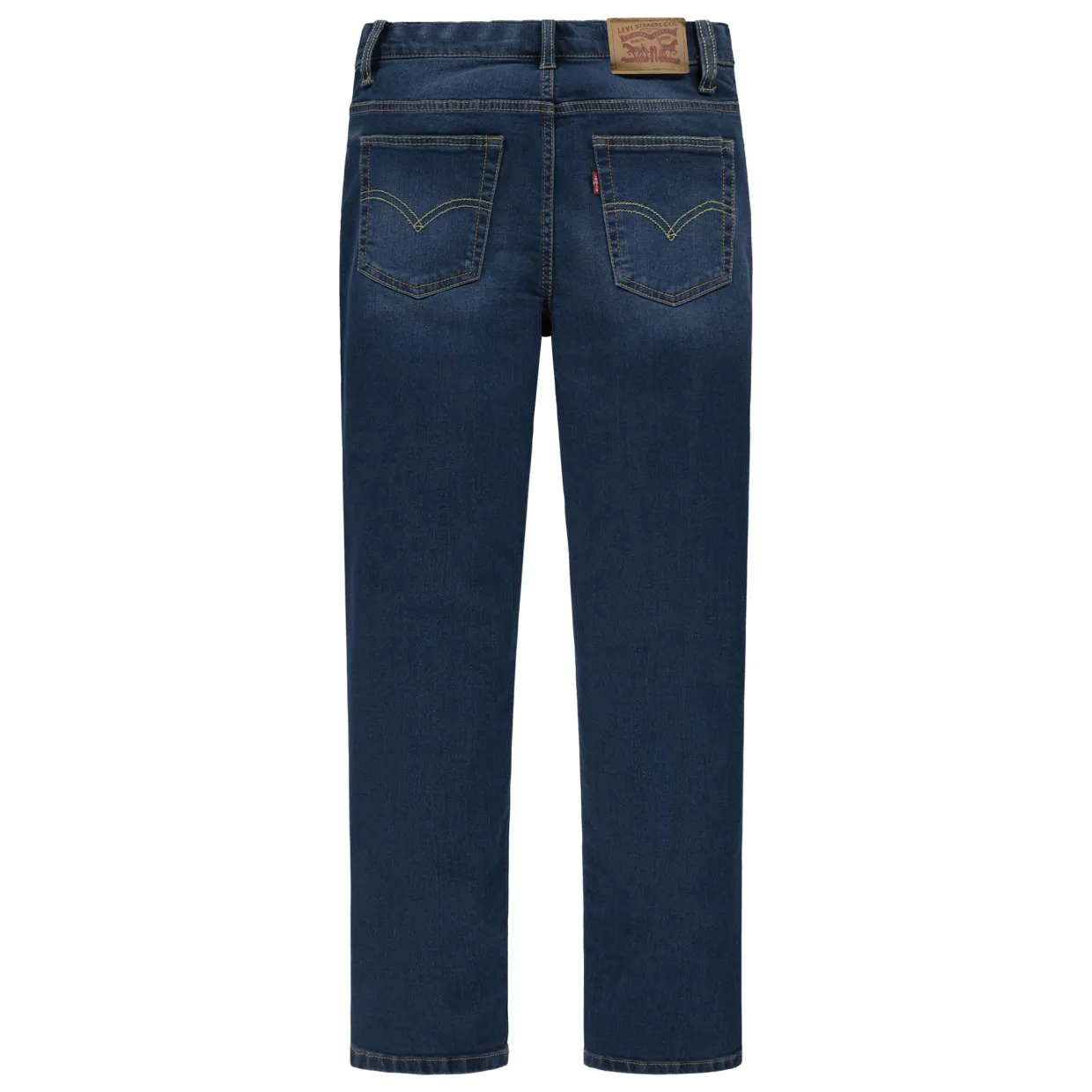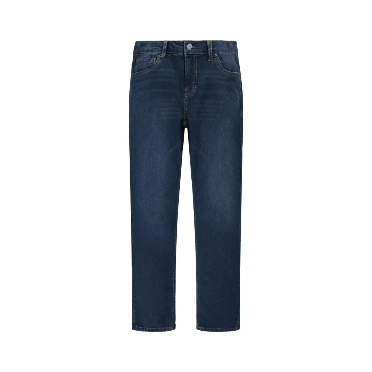 - Tapered silhouette, fly and button fastening, contrast stitching, five-pocket style, whiskering, brand logo patch, dark wash