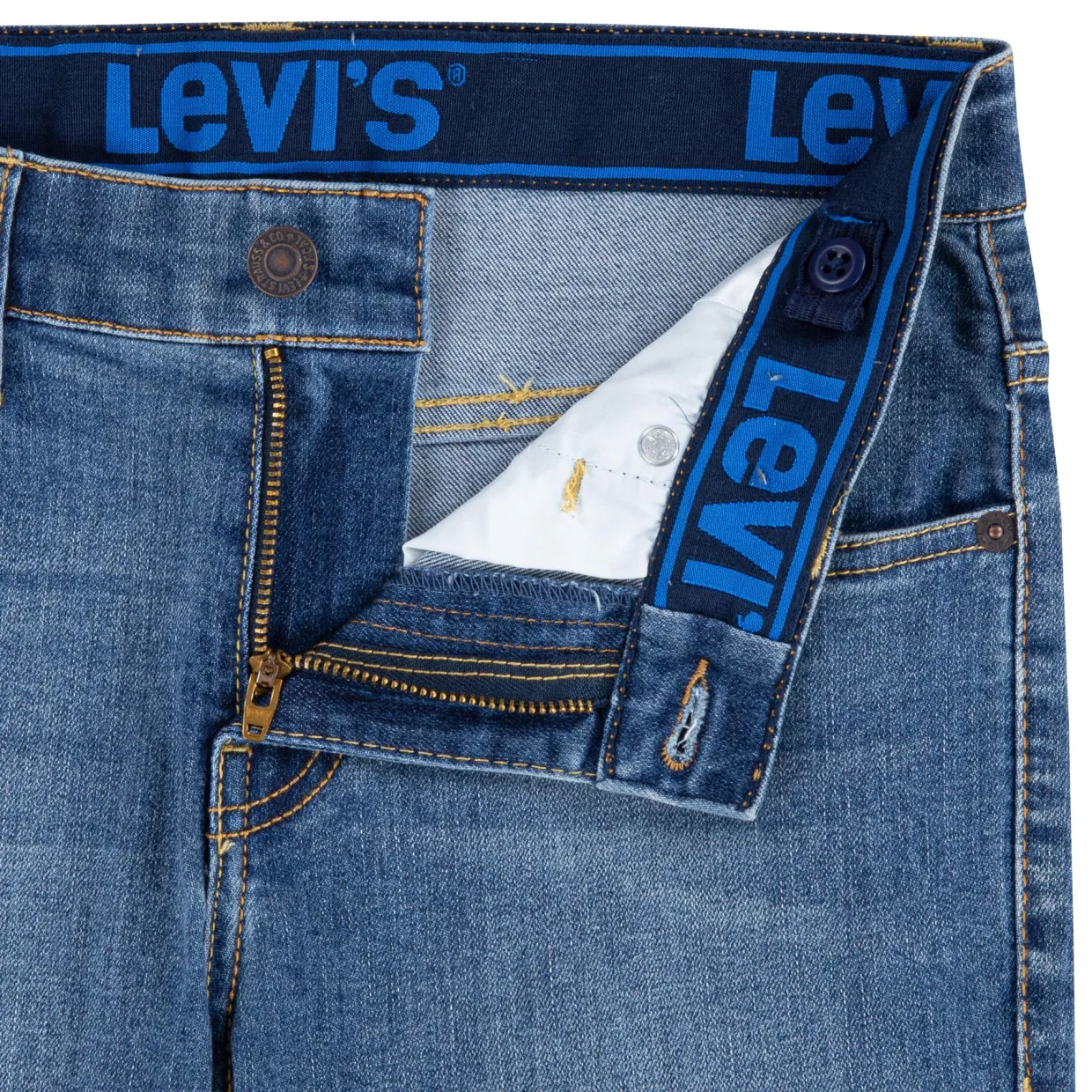 - Slim-leg silhouette, tapered from knee to ankle, adjustable waistband, button and zip fly fastening, five-pocket style, belt loops, brand logo details, mid wash
