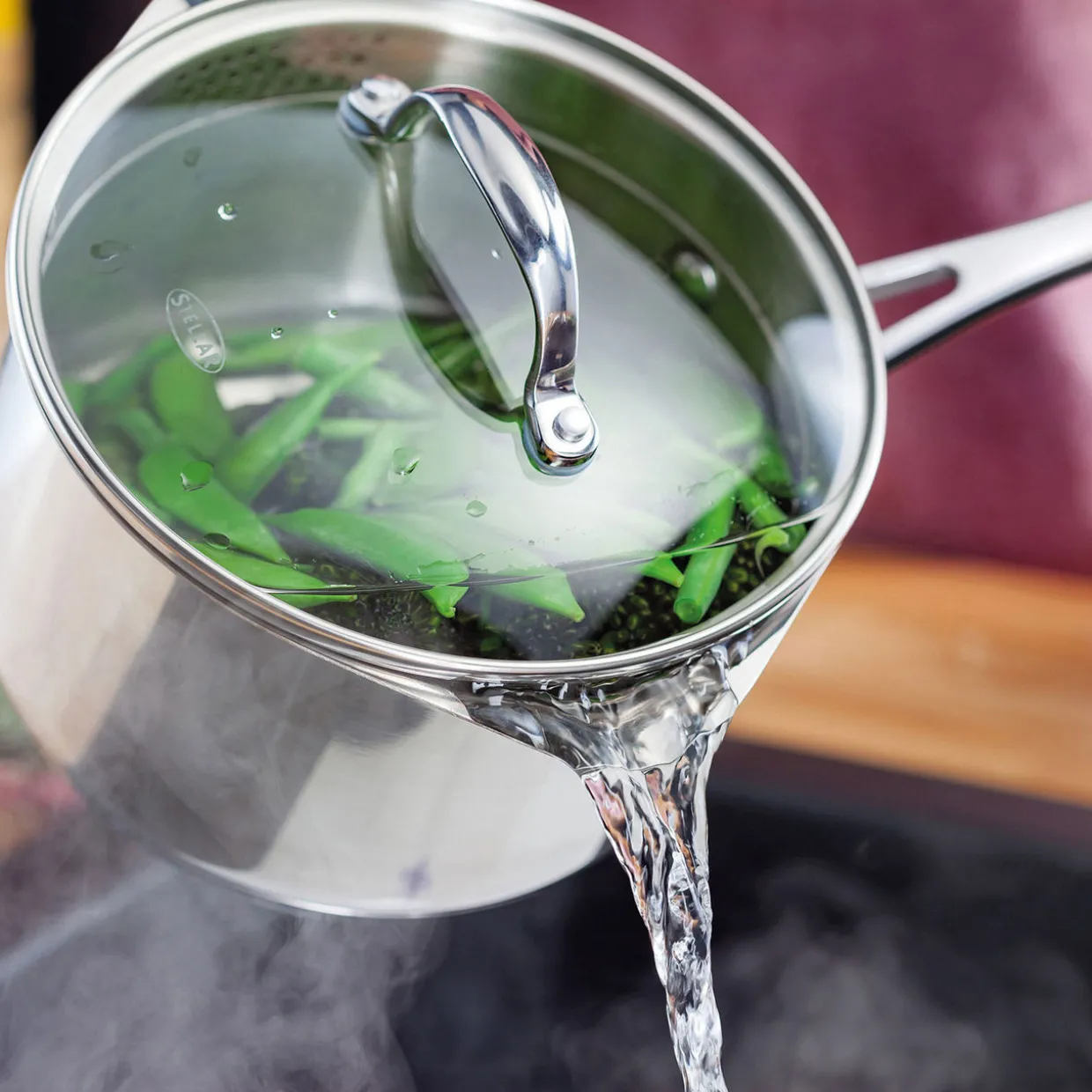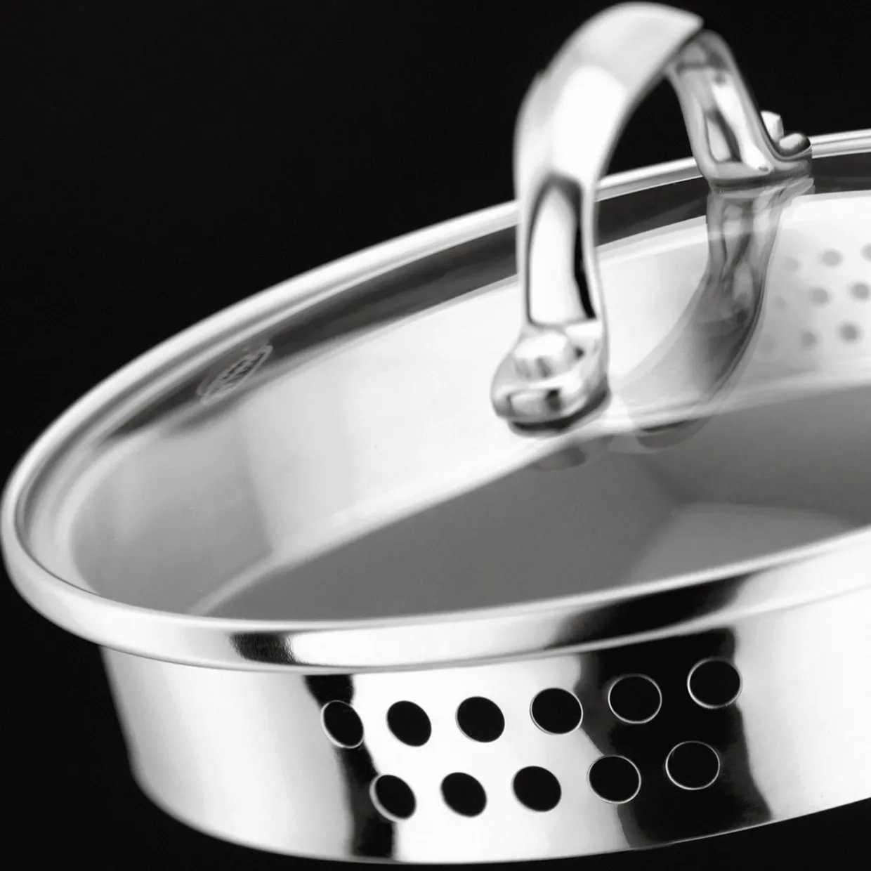 - High conductivity base, time-saving dual-sided glass draining lids with vents for no over-boil, oven-safe strong cast steel handles and polished steel finish