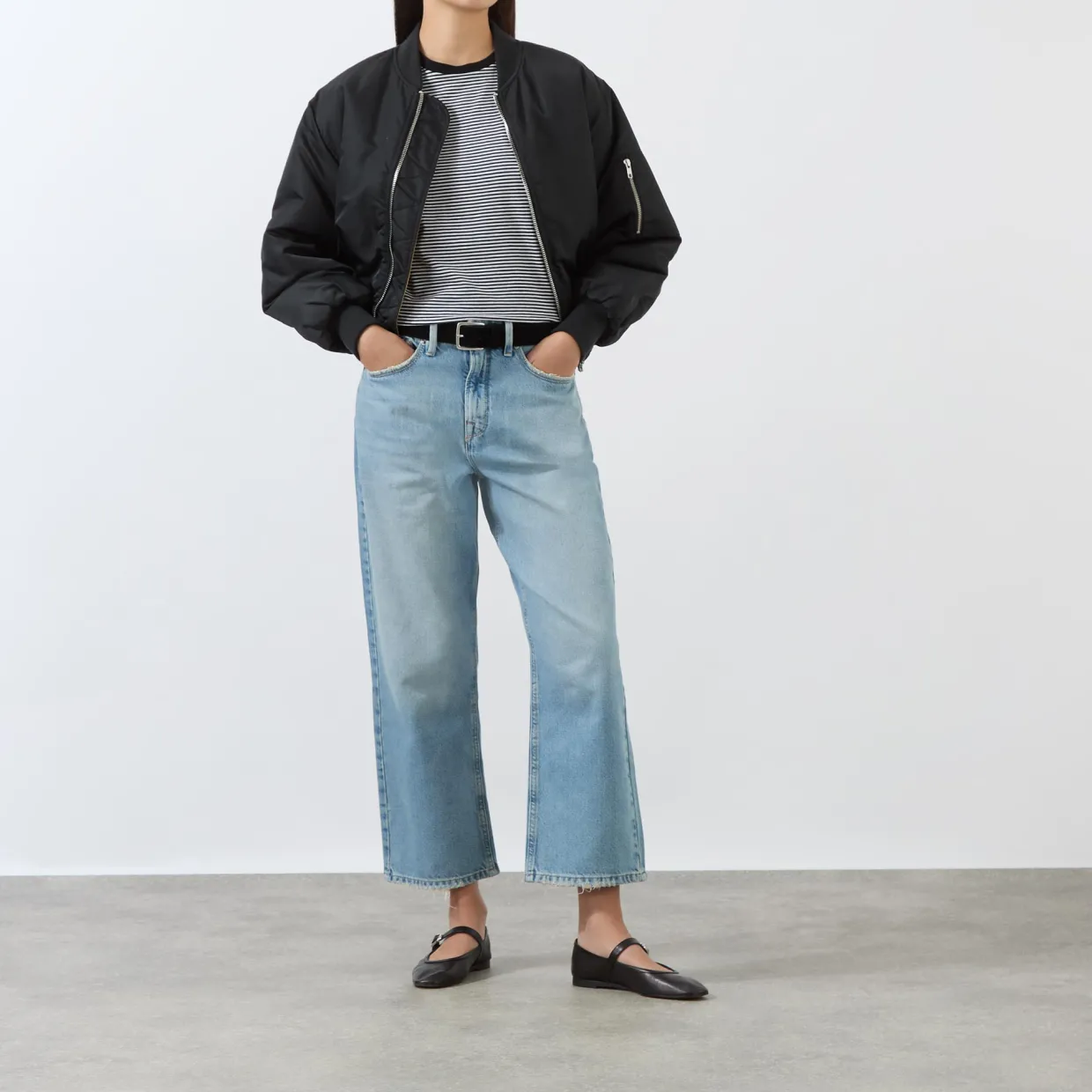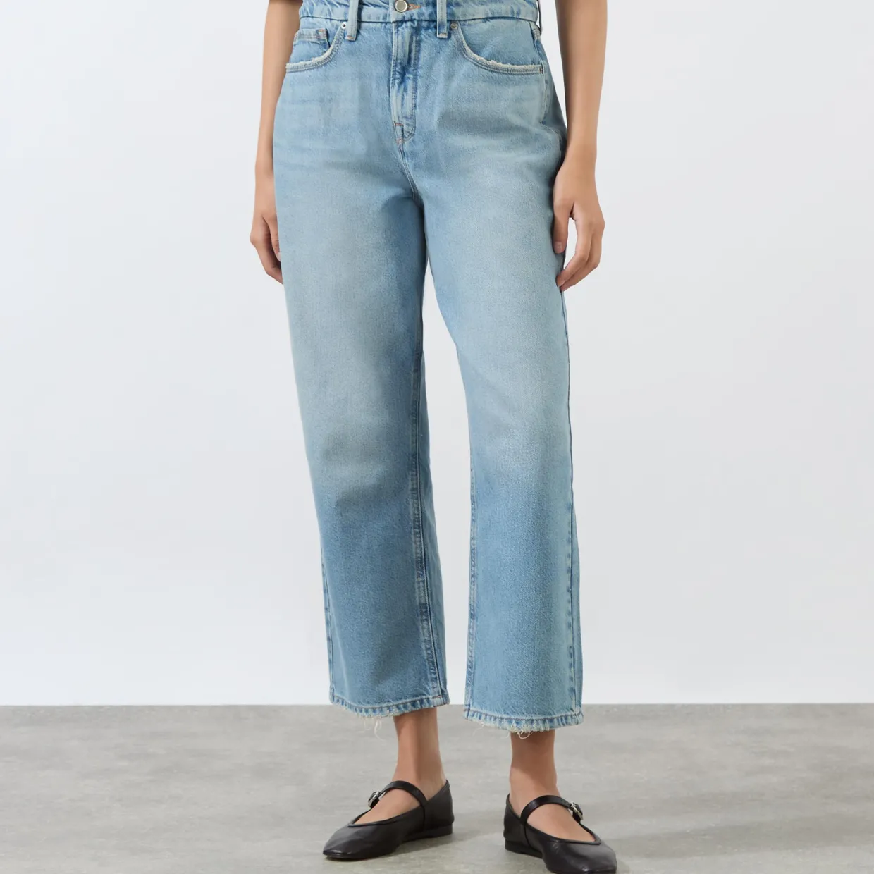 - Mid-rise, straight leg, cropped length, belt loops, five-pocket styling, grinded hems, shape retention, rigid style
