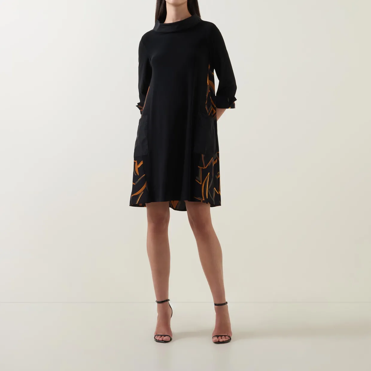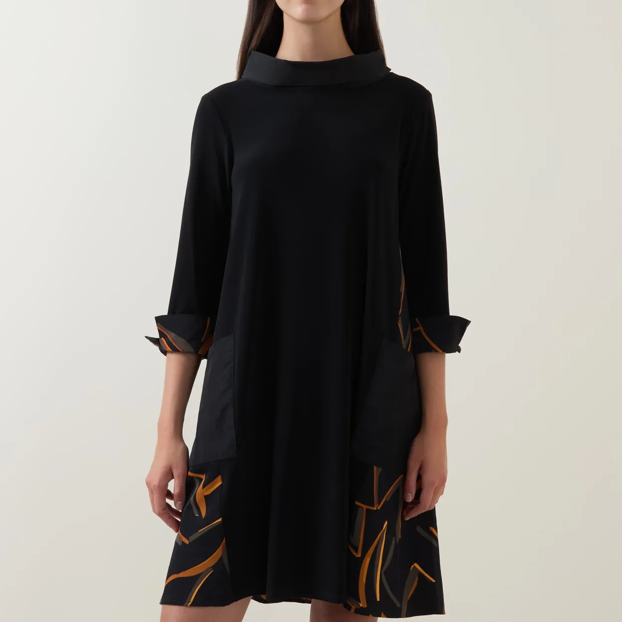 - Cowl neck, three-quarter length sleeves, contrasting turn-up cuffs, rear zip fastening, two patch pockets, flared skirt, high-low hem, contrasting fabric design, midi length