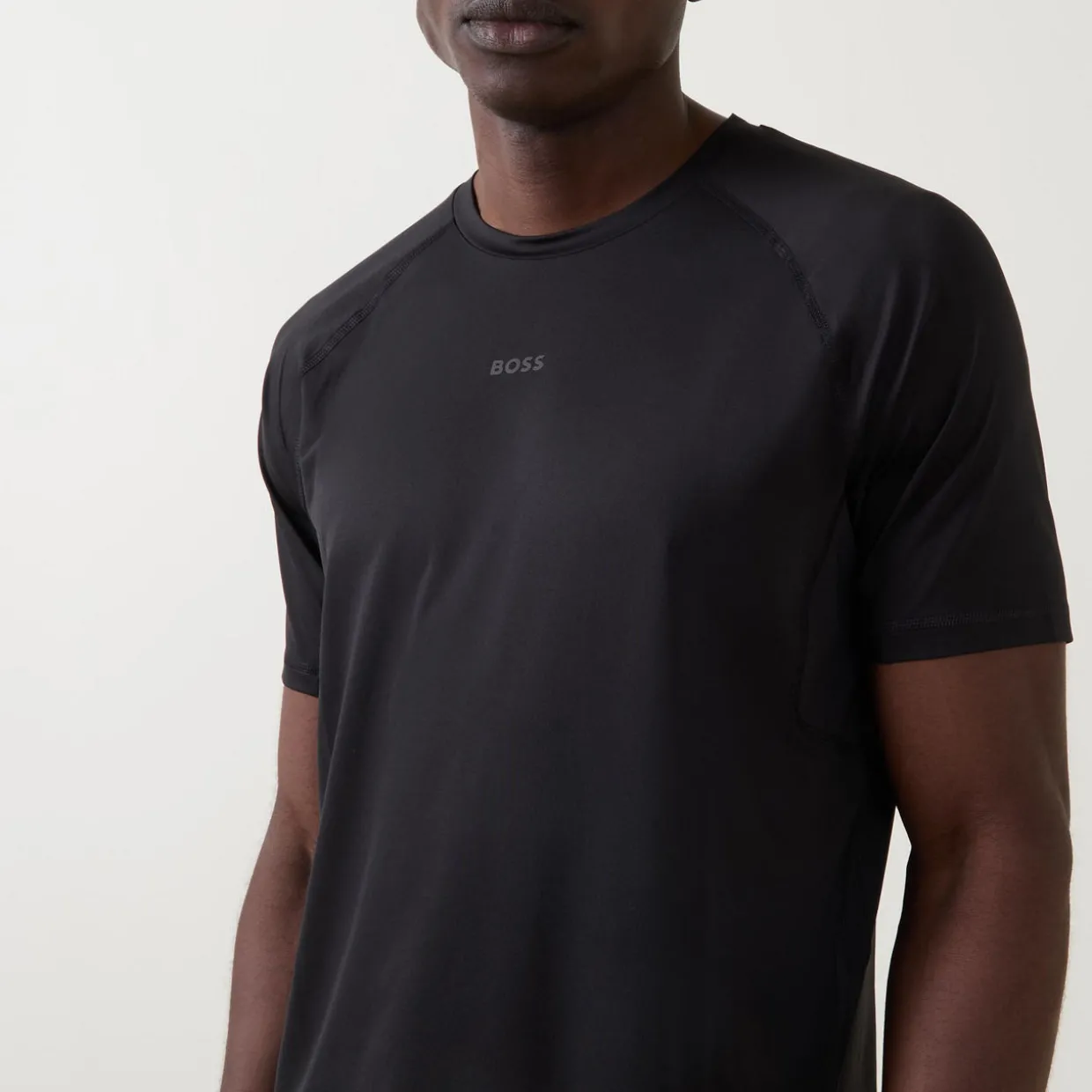 - Short sleeves, crew neckline, tonal logo detail, tonal stitching, straight hemline, smooth fabric