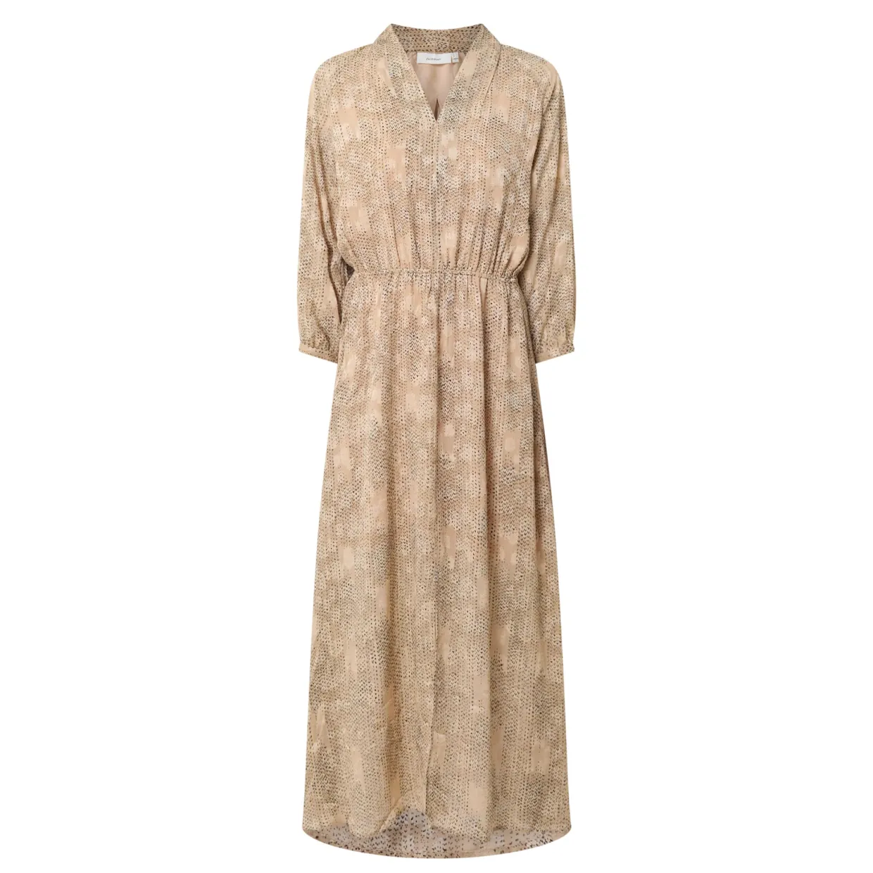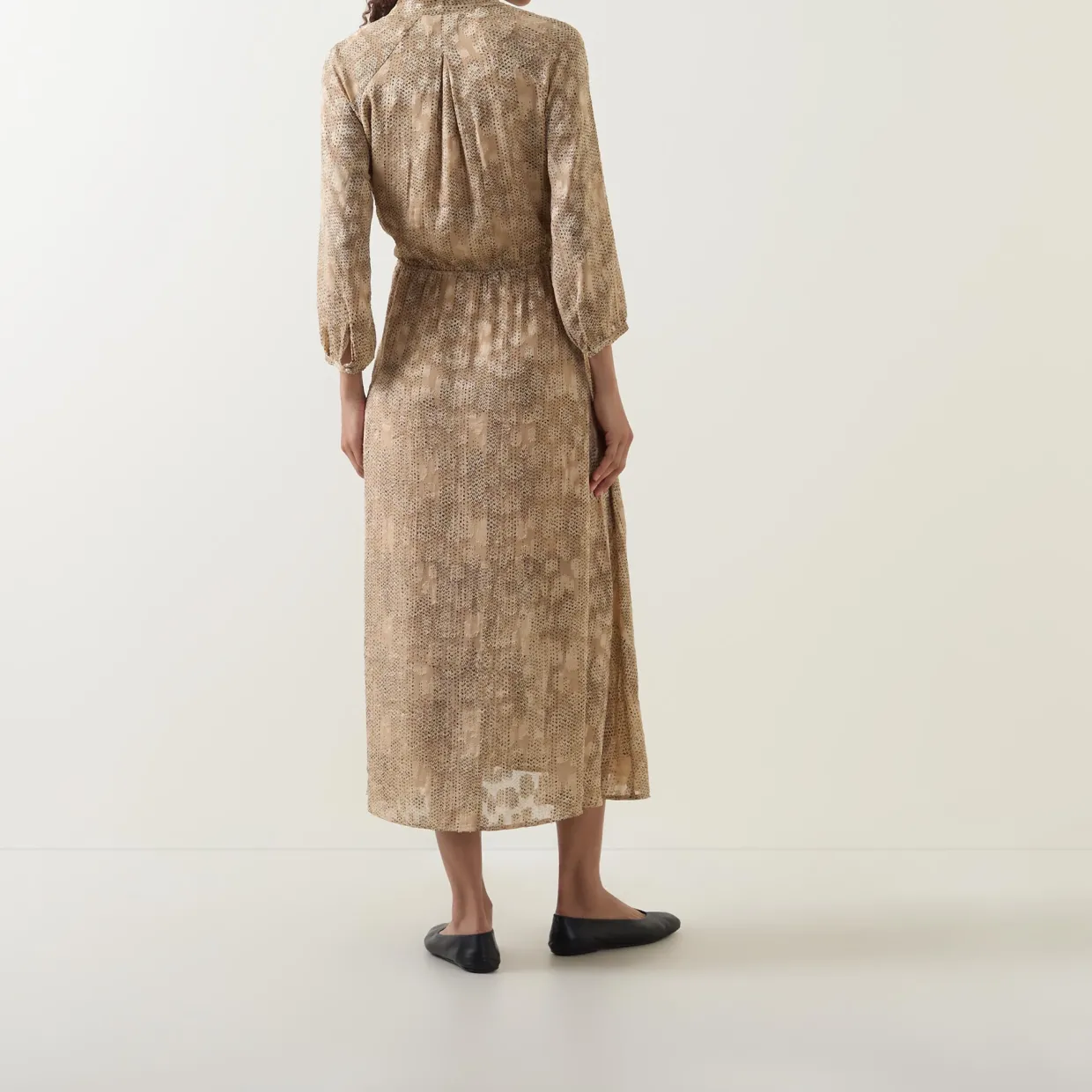 - V-neckline, tonal pattern, dotted details, elasticated waist, midi length, open placket, front slit, buttoned cuffs
