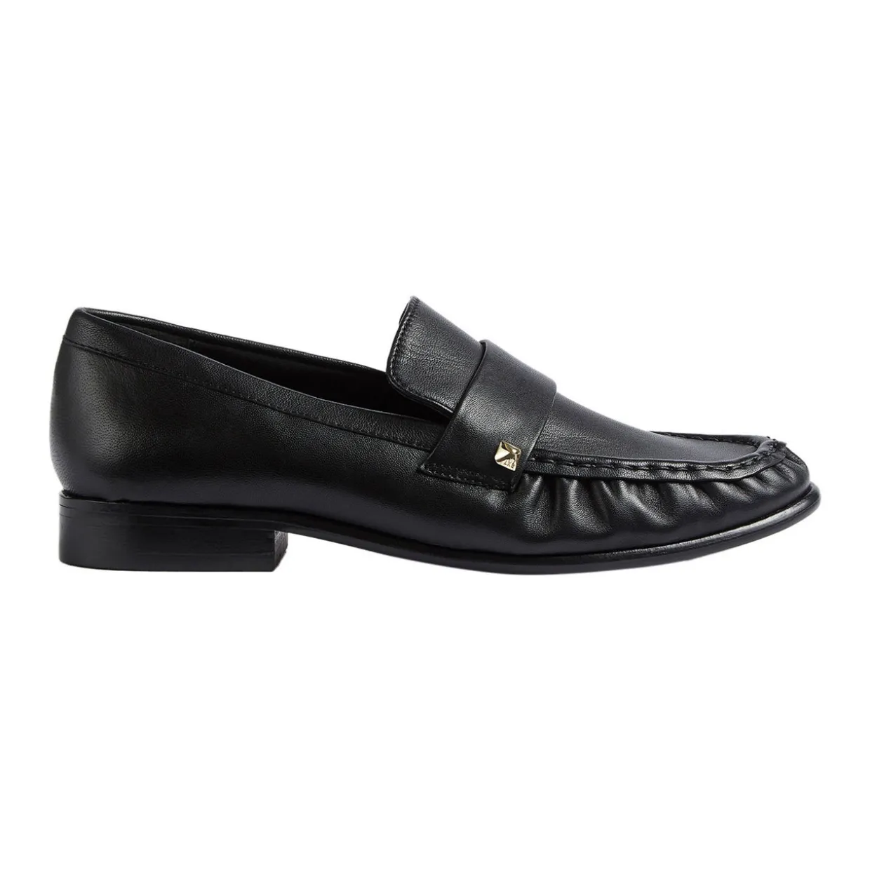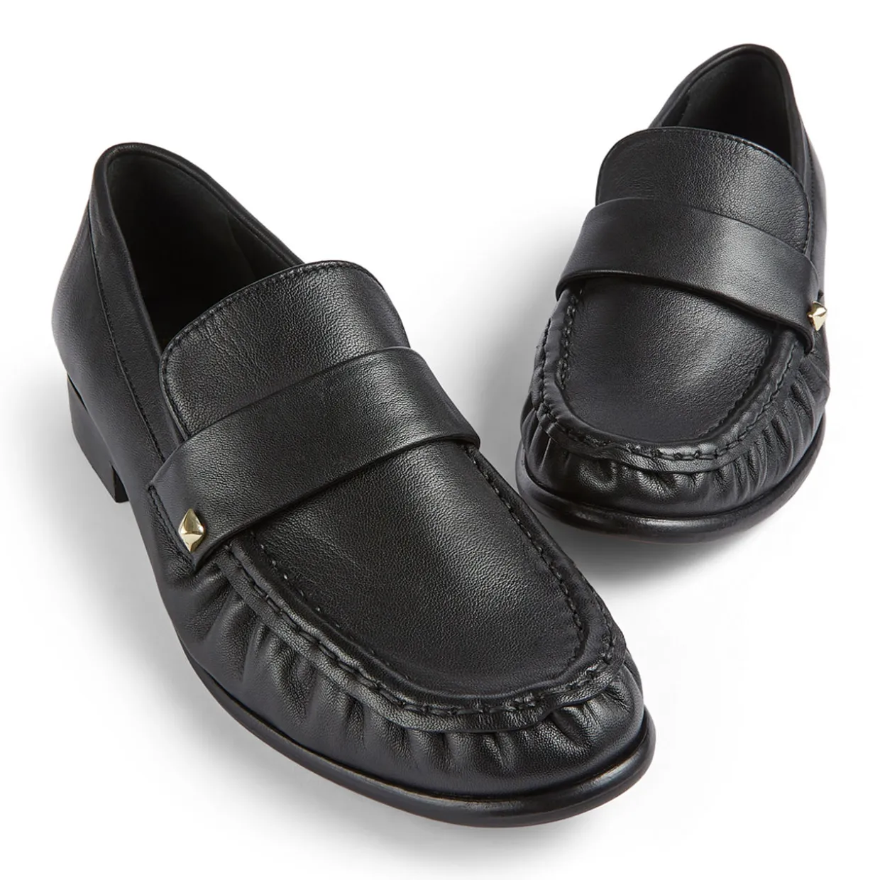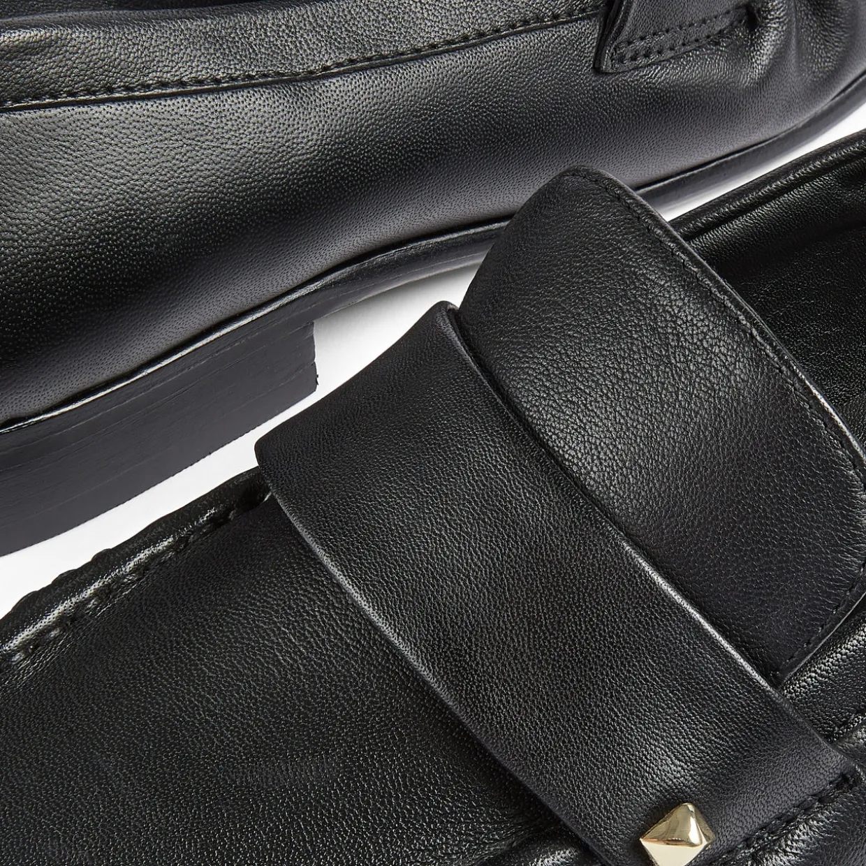 - Round toe, slip-on style, flat sole, tonal stitching, smooth leather finish