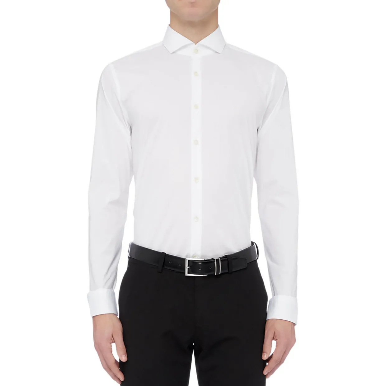 - Long sleeves, pointed collar, button fastenings, structured cuffs