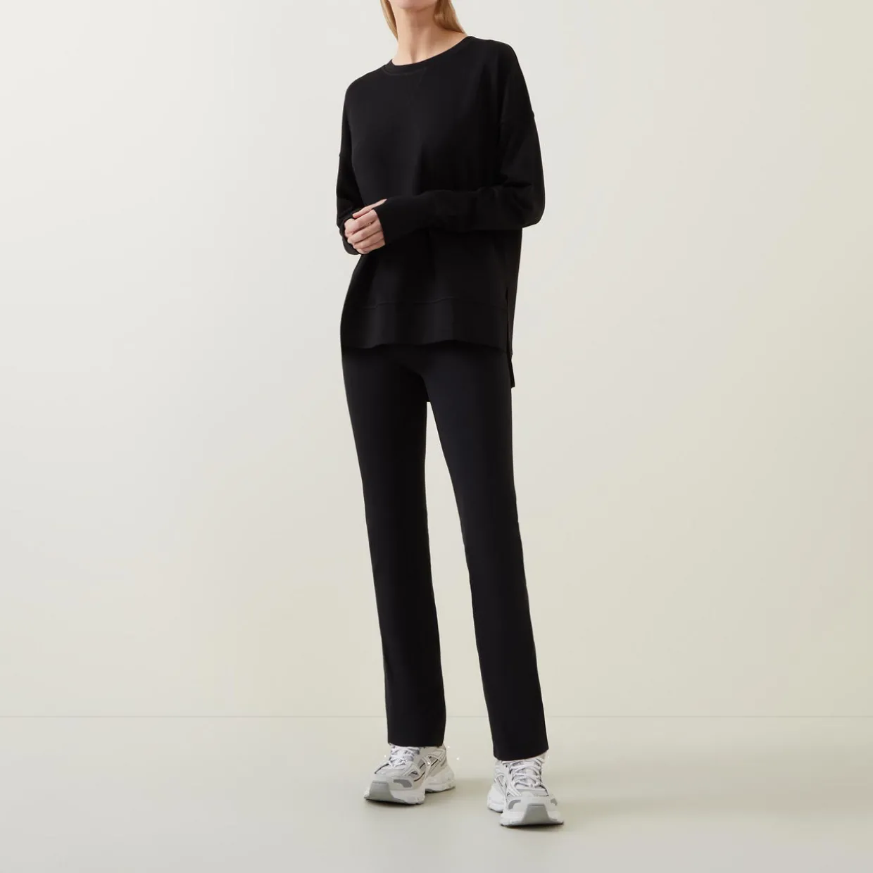 - Relaxed fit, long sleeves, longline length, V-stitch detail, ribbed trims, dropped shoulders, thumbholes, two side slits for easy layering