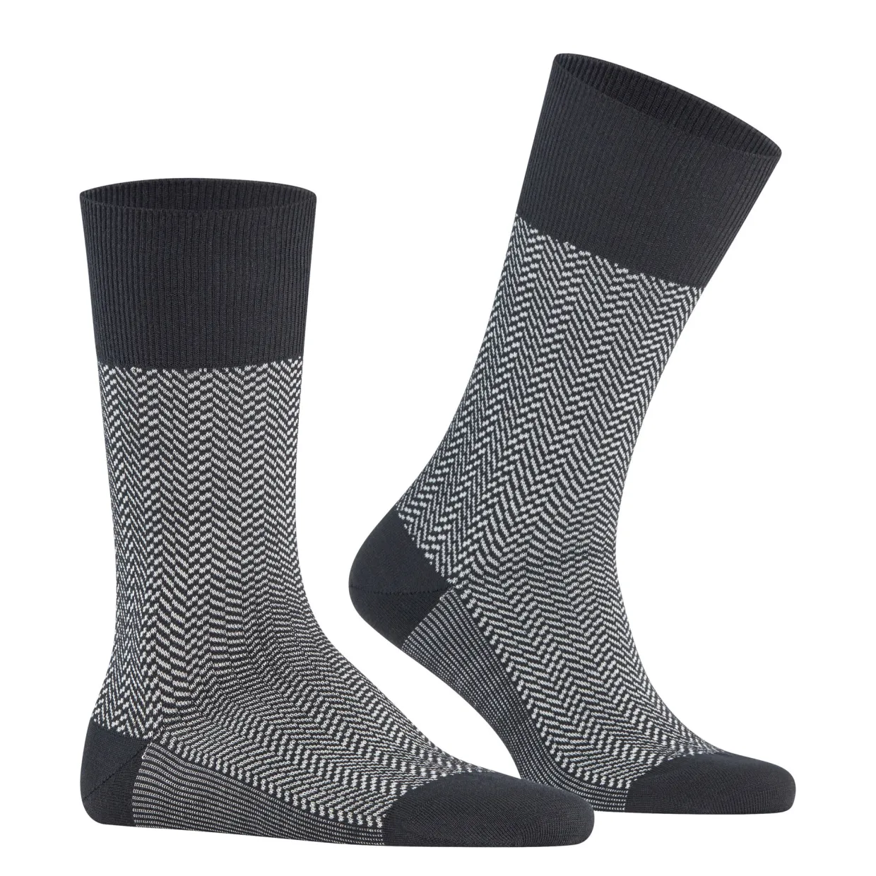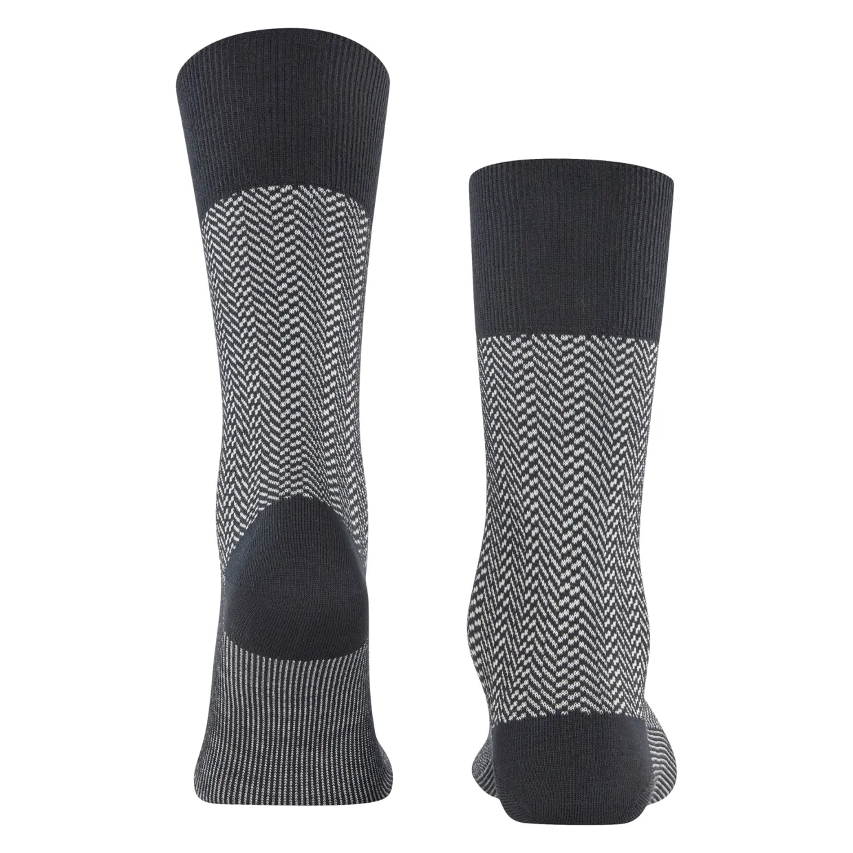 - Soft cotton interior, climate-regulating merino wool exterior, two-tone herringbone pattern, extended cuffs for a wrinkle-free fit, reinforced high-strain zones, durable, Falke Perfect Fit