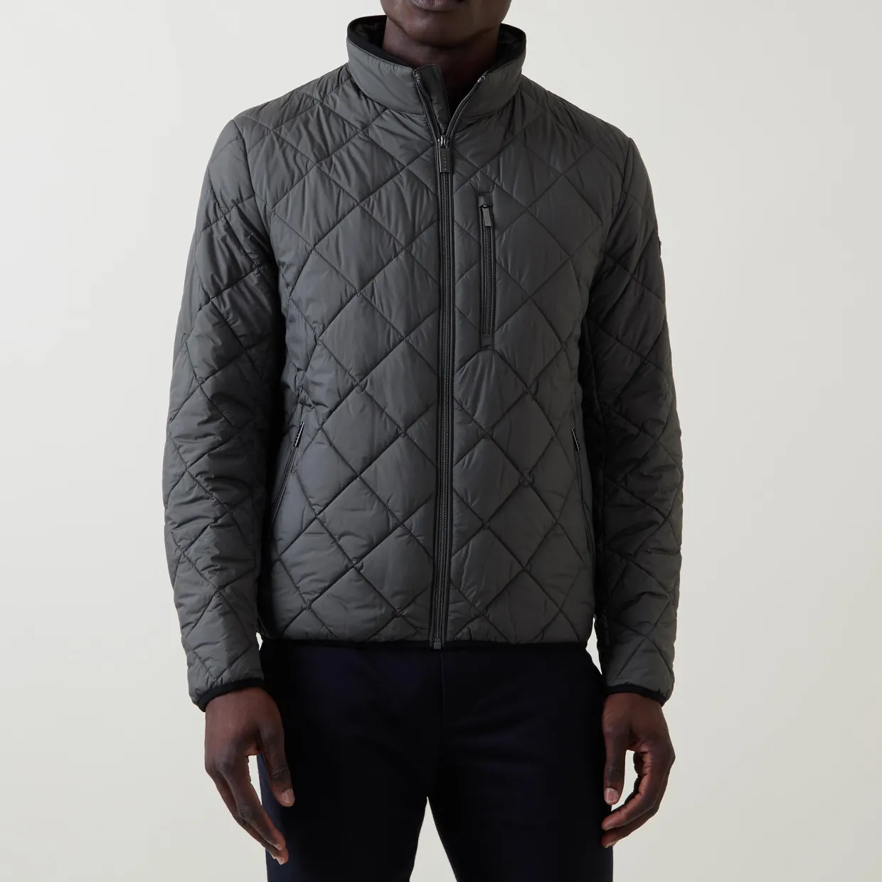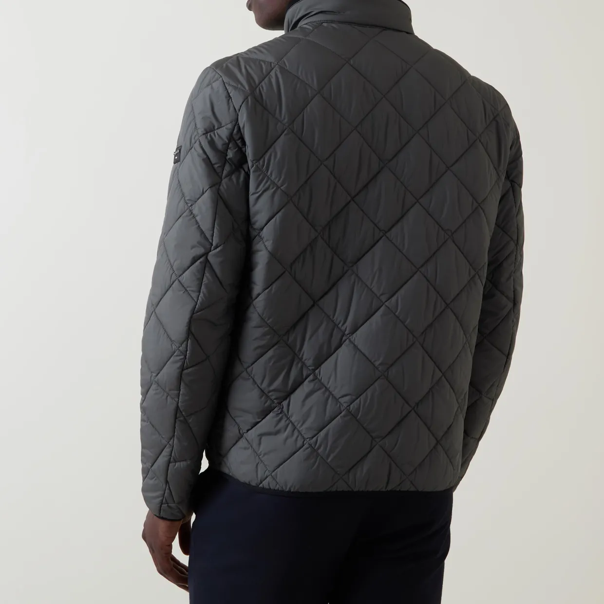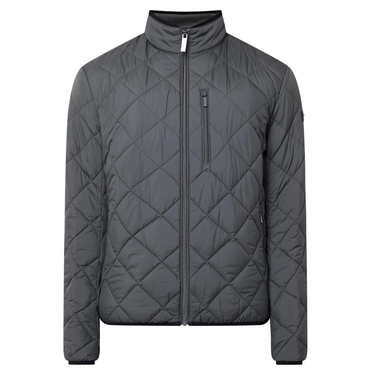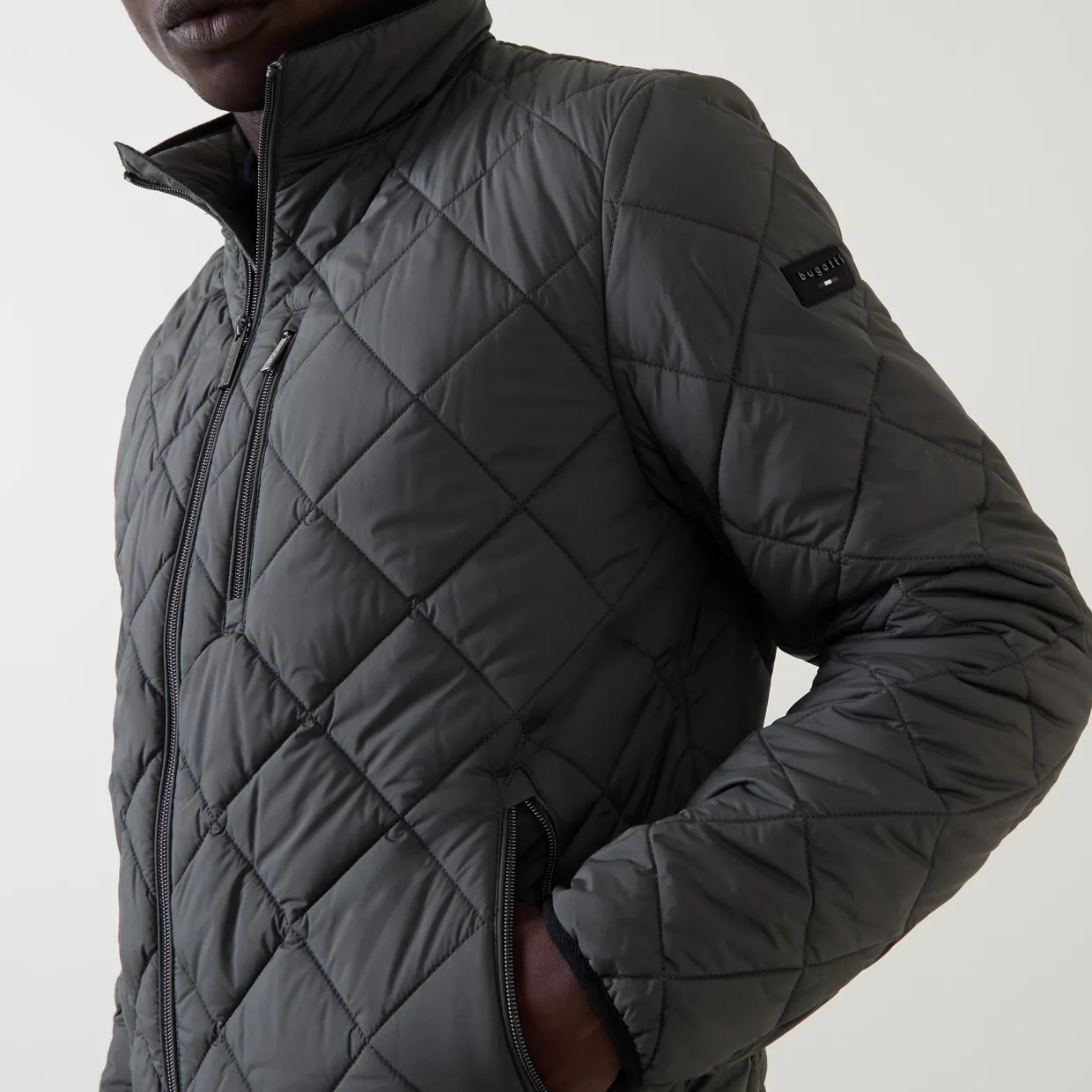 - Stand-up collar, long sleeves, full zip-through fastening, zipped chest pocket, two side zipped pockets, logo badge on left sleeve, diamond quilted finish