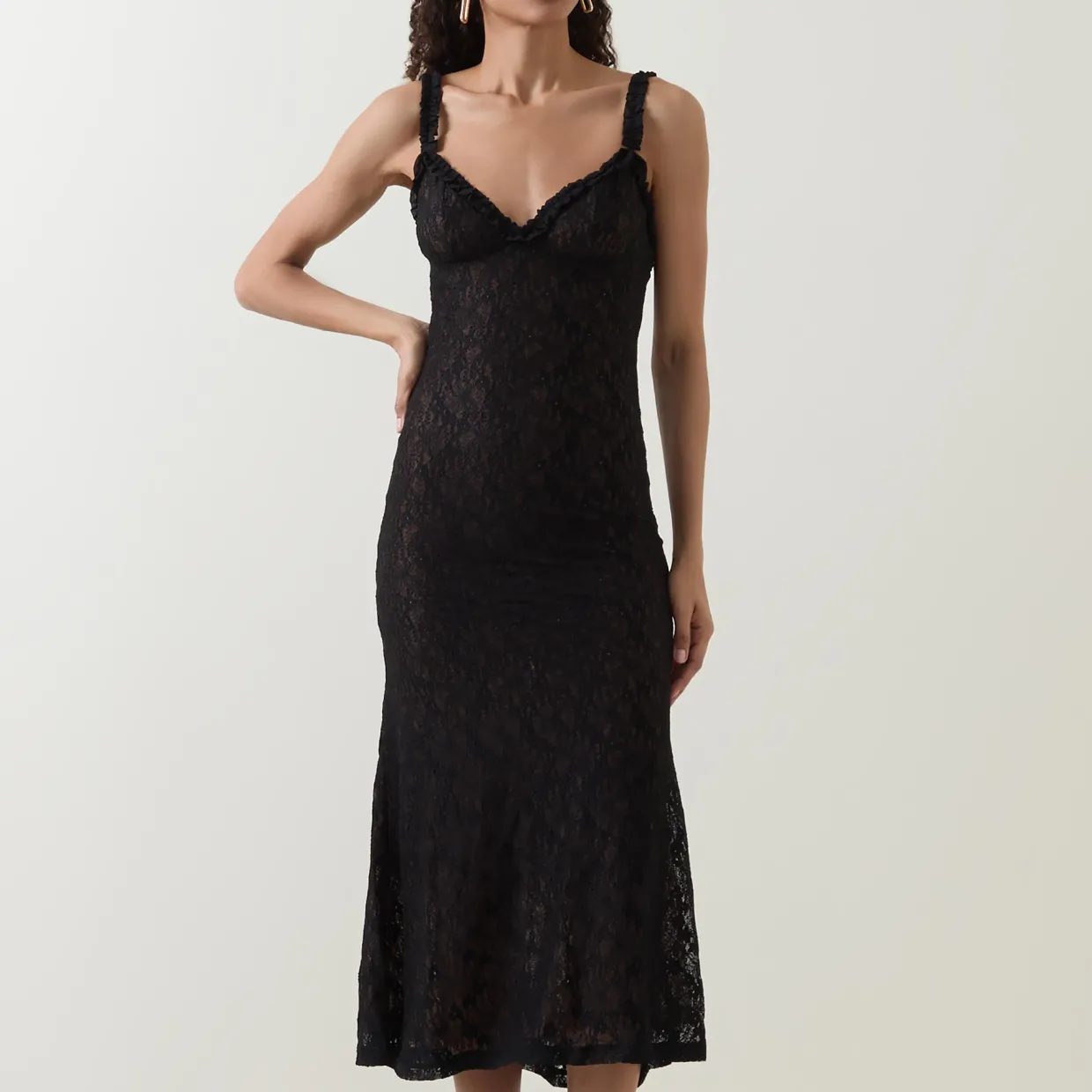 - Sleeveless, wide straps, sweetheart neckline, ruffle trimming, all-over lace design, flared silhouette, midi length