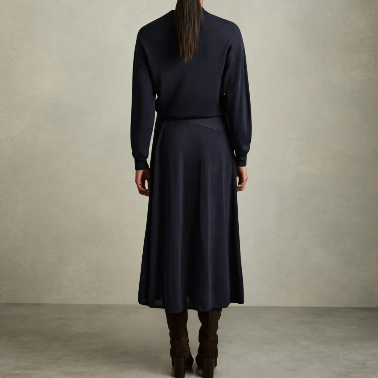- Compact knit, high roll neckline, drop shoulders, D-ring belt, side slit, midi length, long sleeves