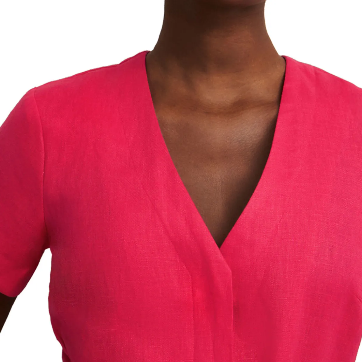 - V-neck, cropped length, short sleeve, side pockets, concealed fastening, detachable tie waist