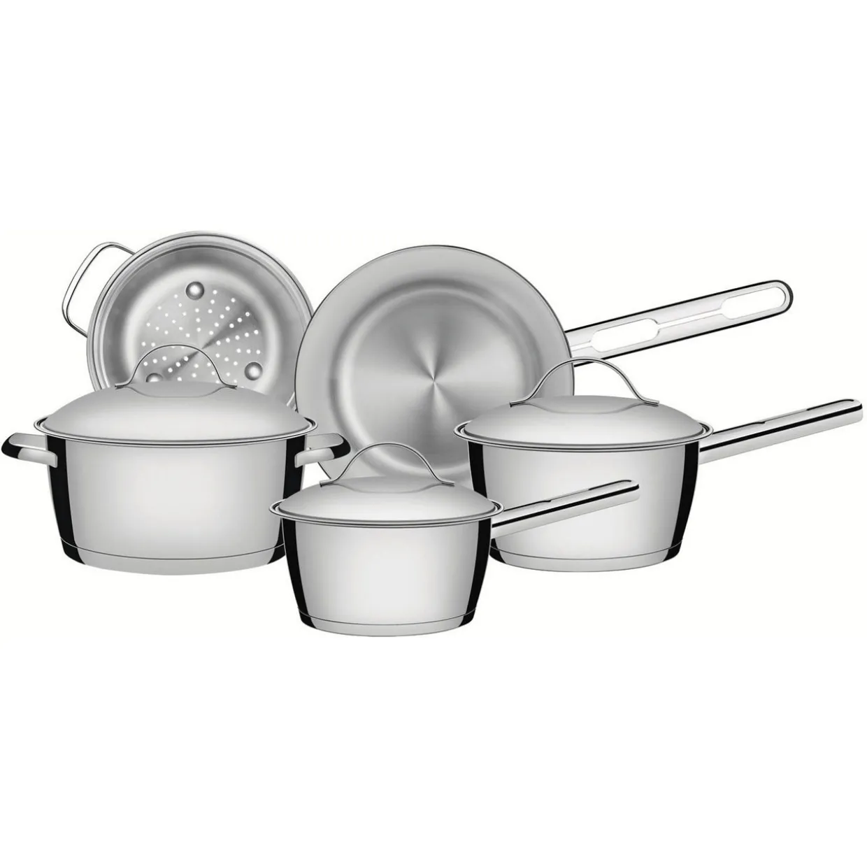 - Set contains sauce pan with lid, deep casserole with lid, casserole with lid, frying pan and steamer, each piece features a triple layer base (stainless steel + aluminium + stainless steel) and even heat distribution for more efficient cooking