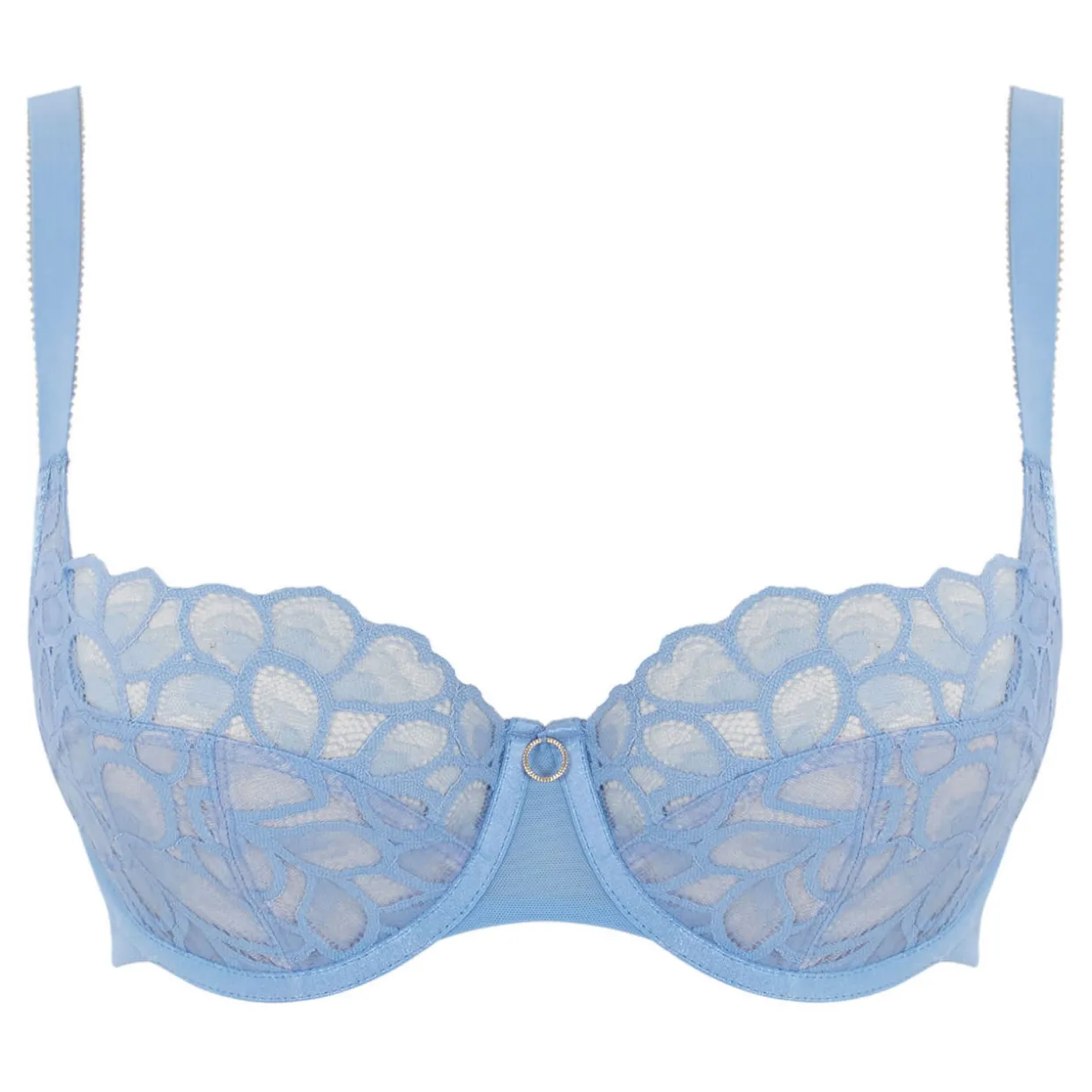 - Four-piece balcony bra, stretch-fused lace top cup, lined bottom cups, stretch-fused lace with organic line detailing, inner side sling for forward projection, fully adjustable straps for support, lined cups and power mesh wings for supportive fit, lighter look
