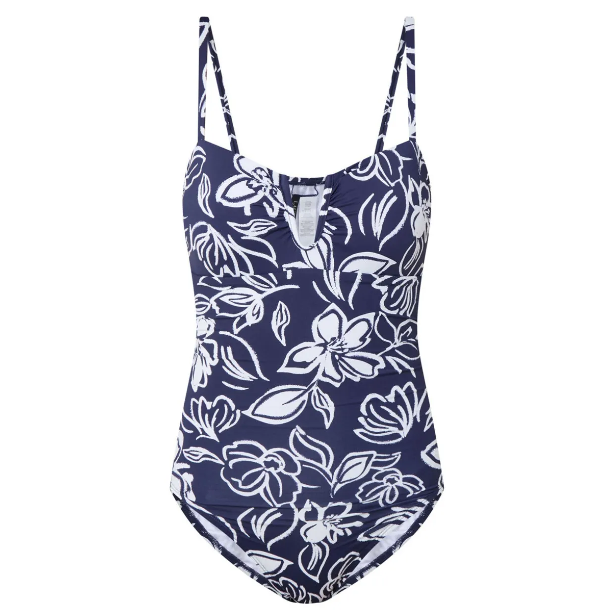 - Split neckline, V-shaped hardware, detachable and adjustable straps, ruched detailing, classic coverage, gold-tone hardware, Alora Floral print, two-tone design, smooth finish
