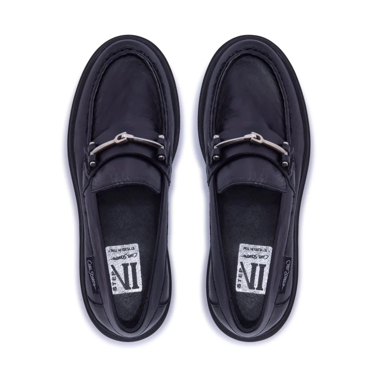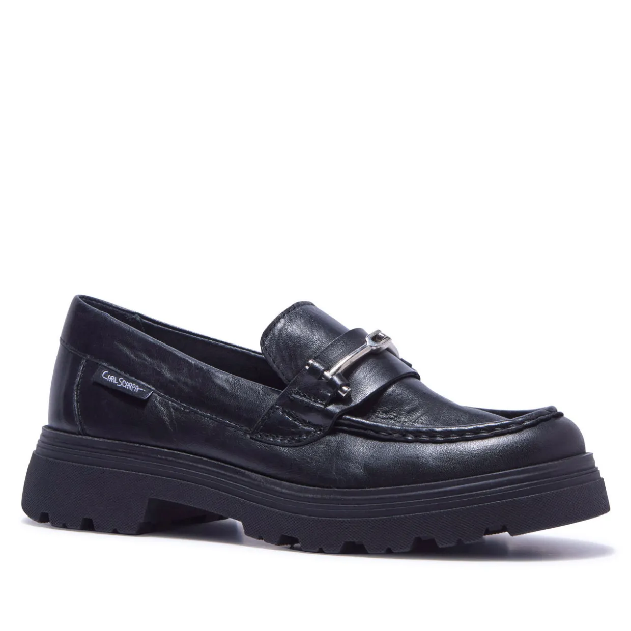 - Leather upper, stitched apron vamp, polished silver-tone snaffle hardware, burnishing at heel and toe, leather lining, chunky sole, round toe, slip-on style, brand logo detail