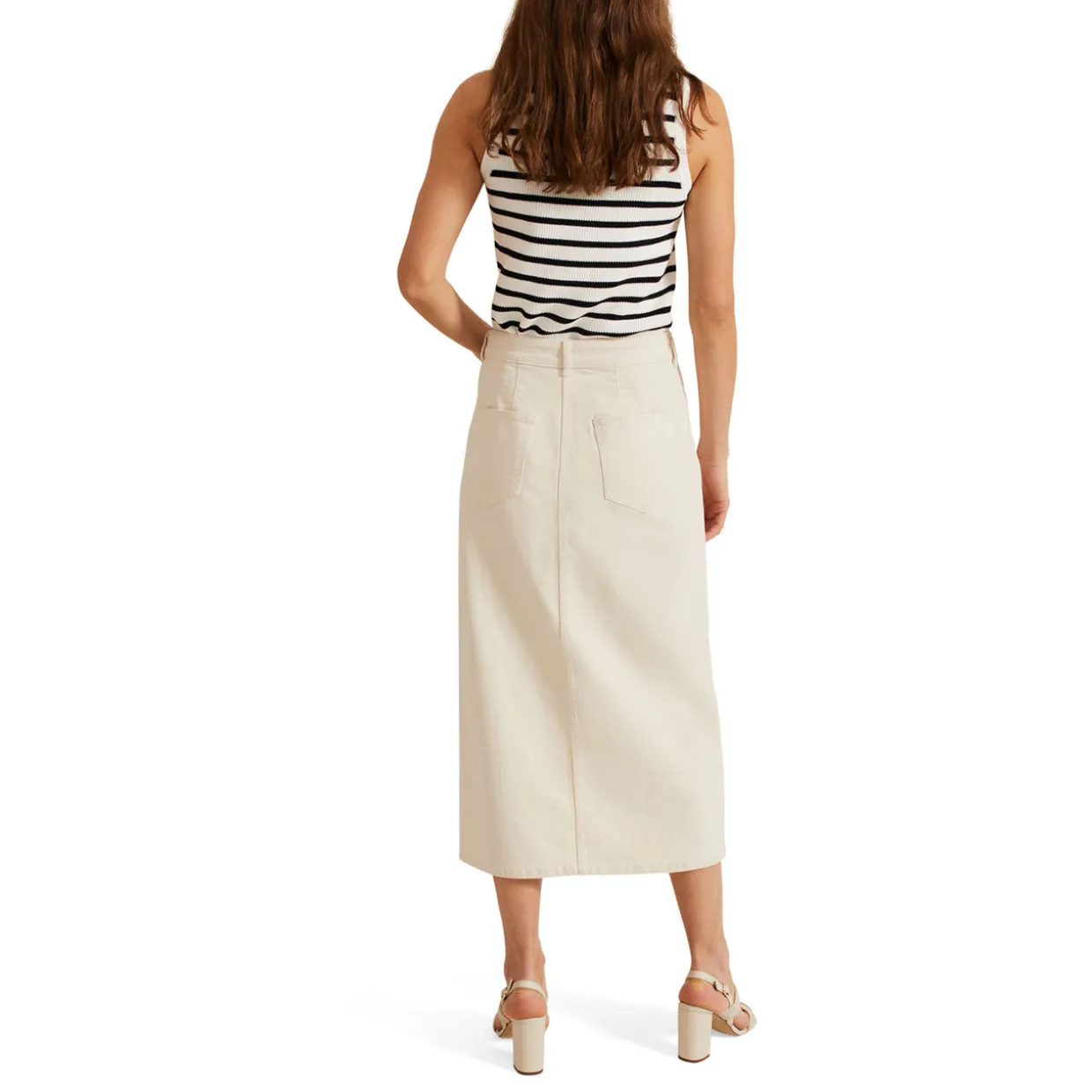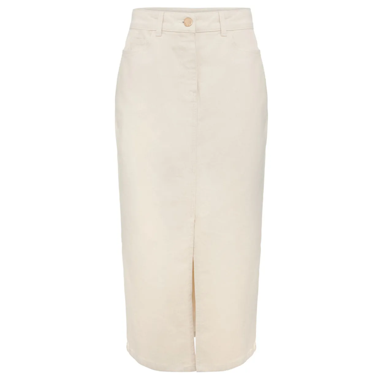 - Maxi length, button and zip fly, belt loops, front slit, denim texture, hip pockets