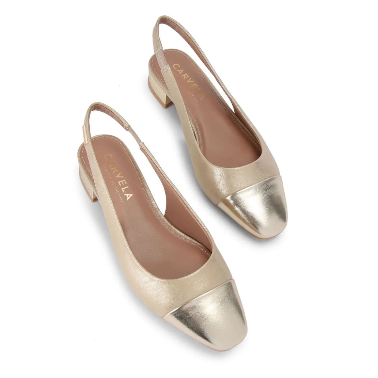 - Slingback silhouette, almond toe, patent toe cap, elasticated strap, slip-on style, gold-tone branding details, metallic block heel