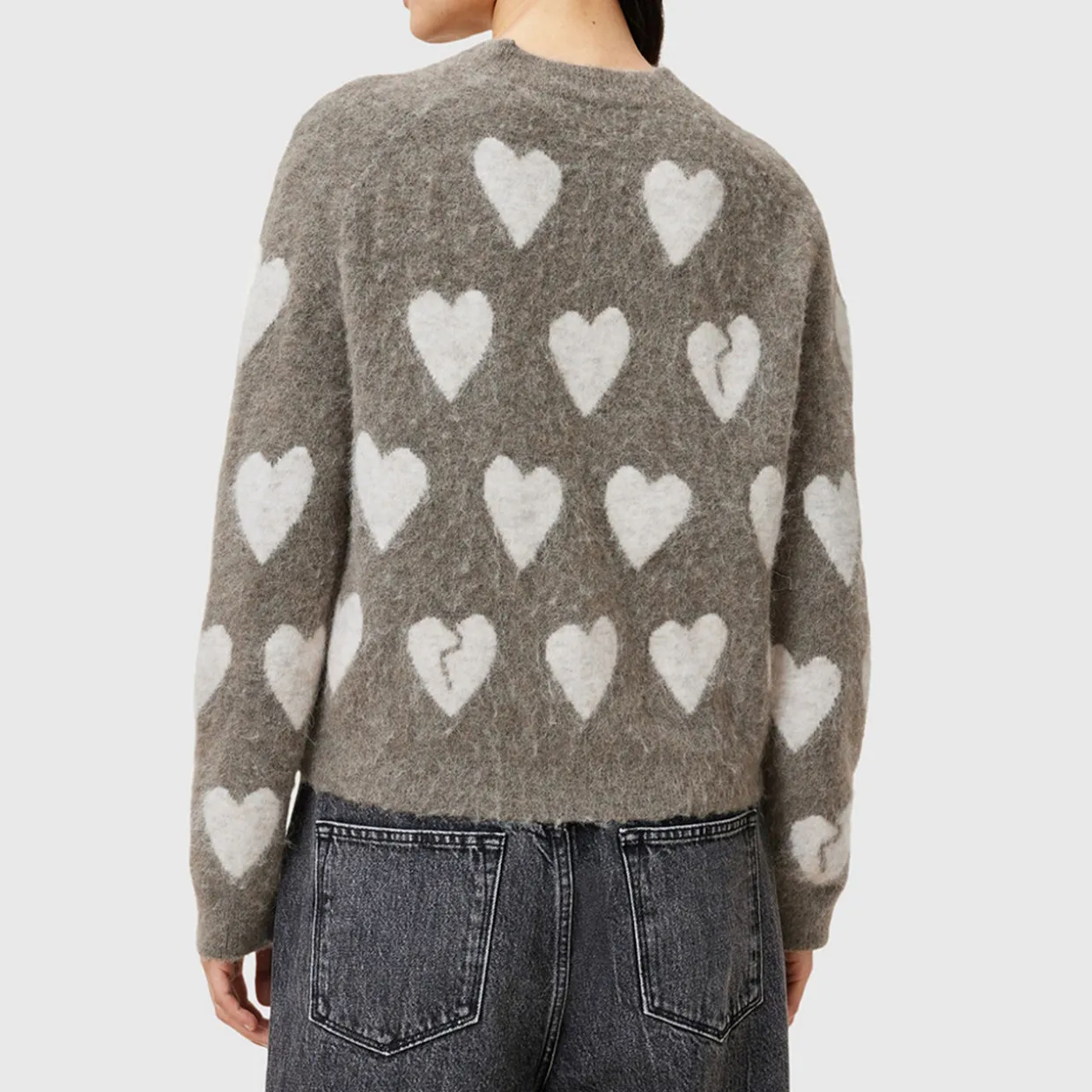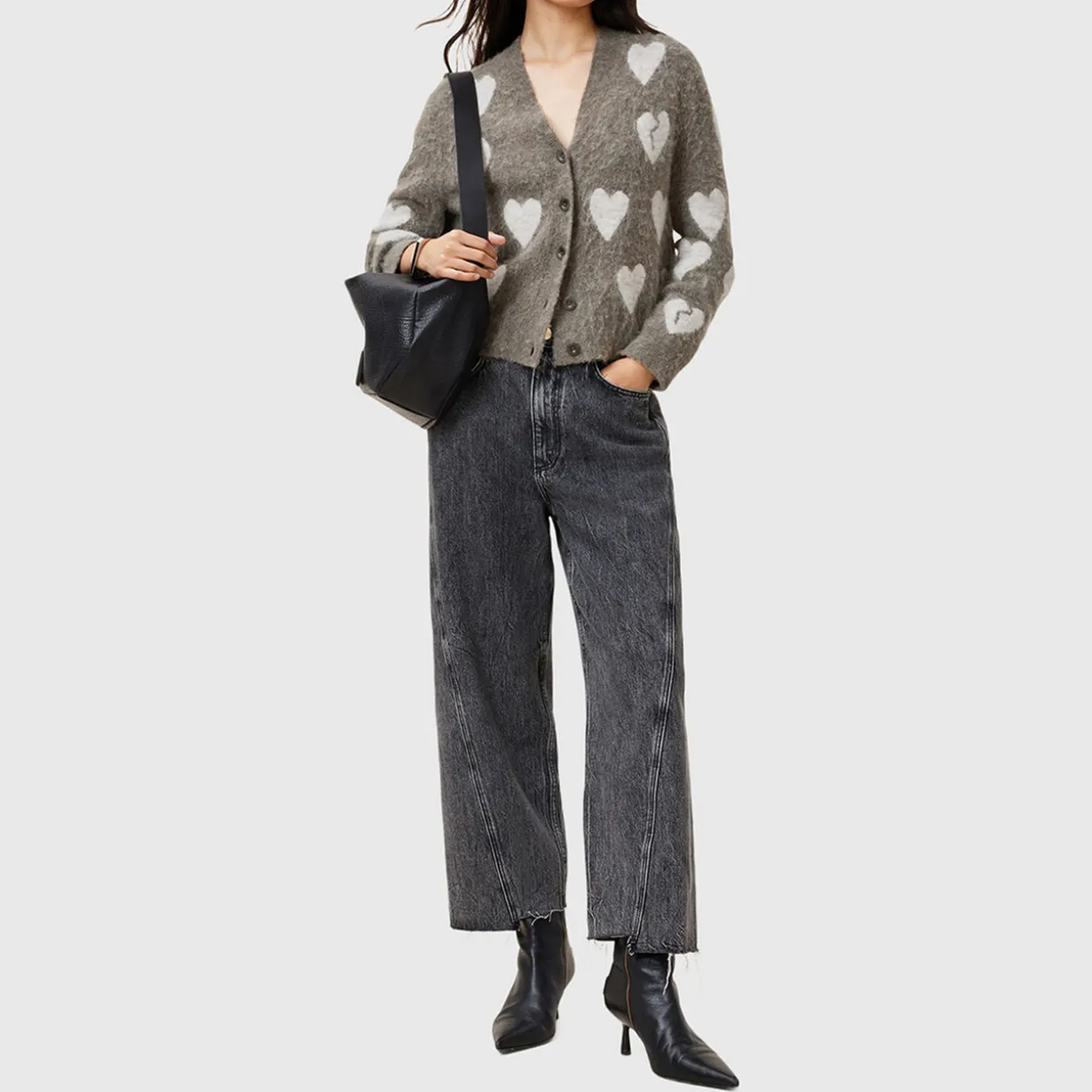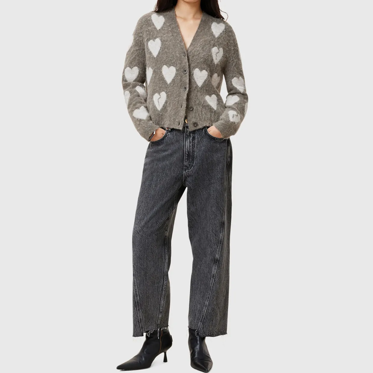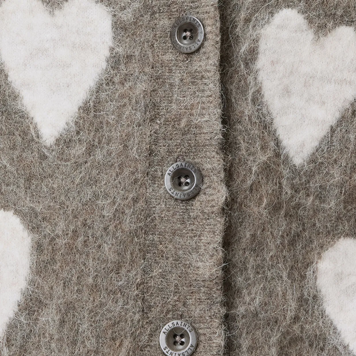 - V-neckline, long sleeves, button fastening, dropped shoulders, contrasting heart motif, ribbed trims, knitted finish