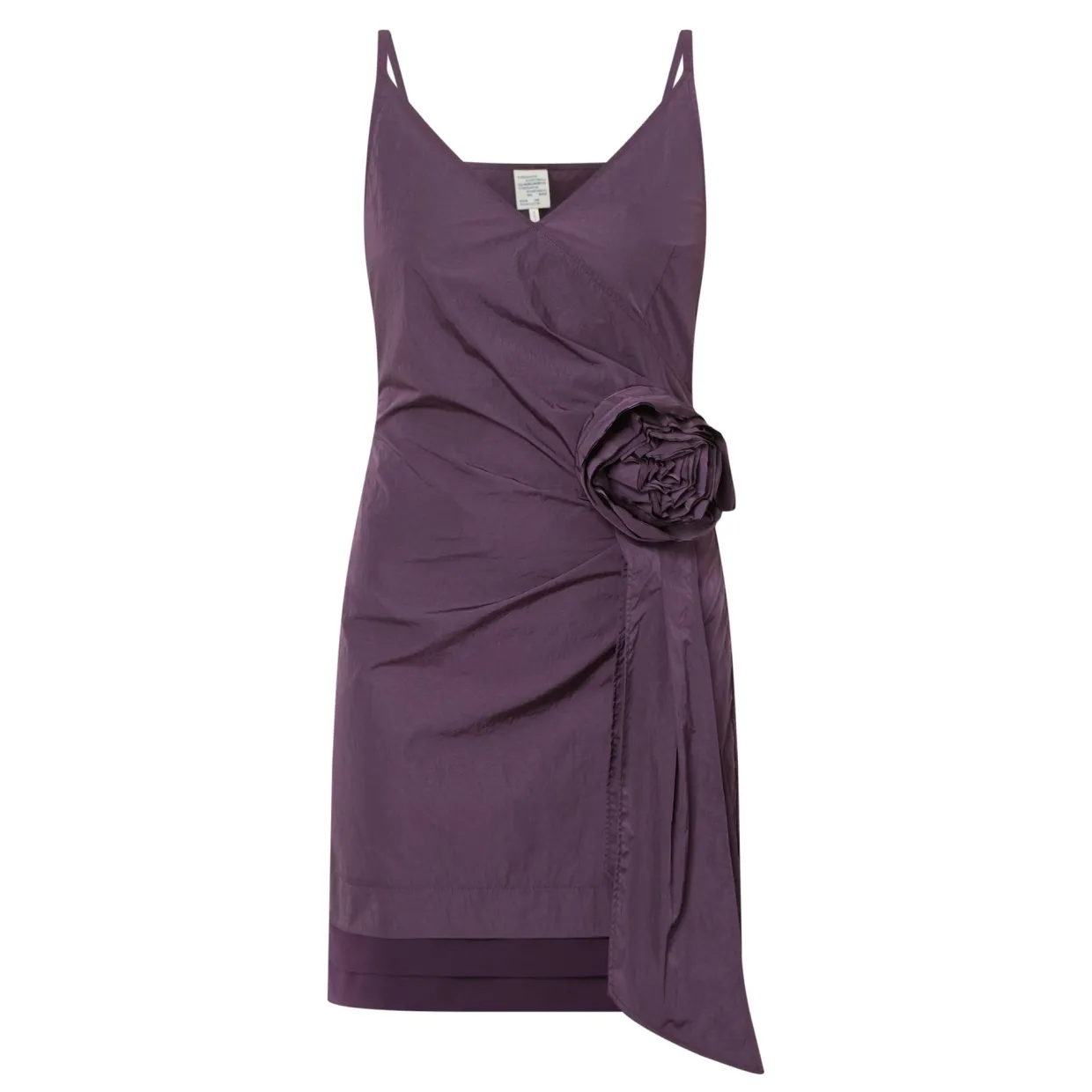- Thin fixed straps, sleeveless, V-neckline, ruched seams at the back, rosette detail at the waist, fitted silhouette, mini length