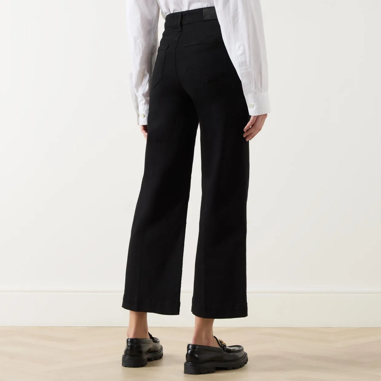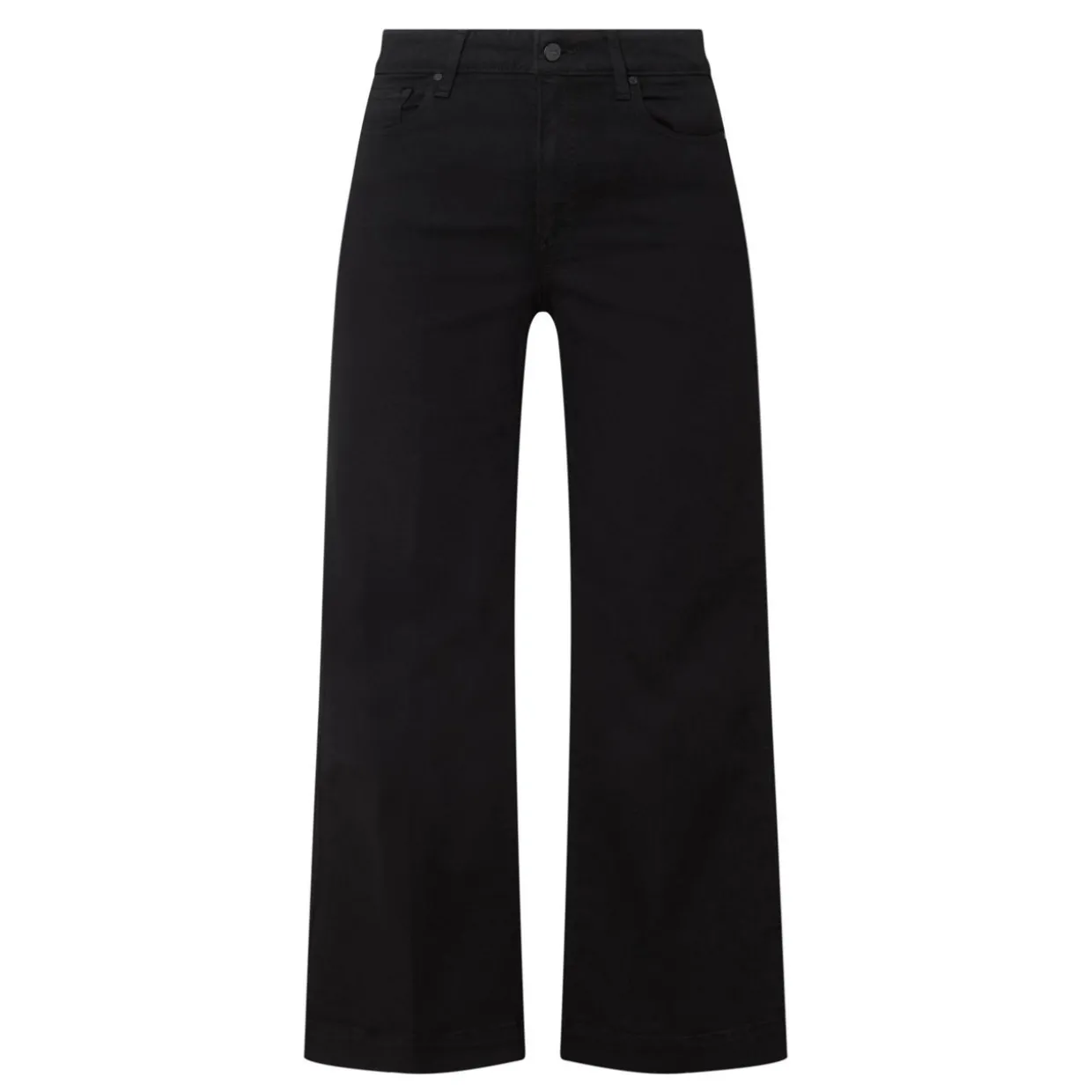 - High-rise, wide-leg, cropped length, belt loops, concealed fly and button fastening, five-pocket styling, clean hems, tonal hardware, stretch fabric