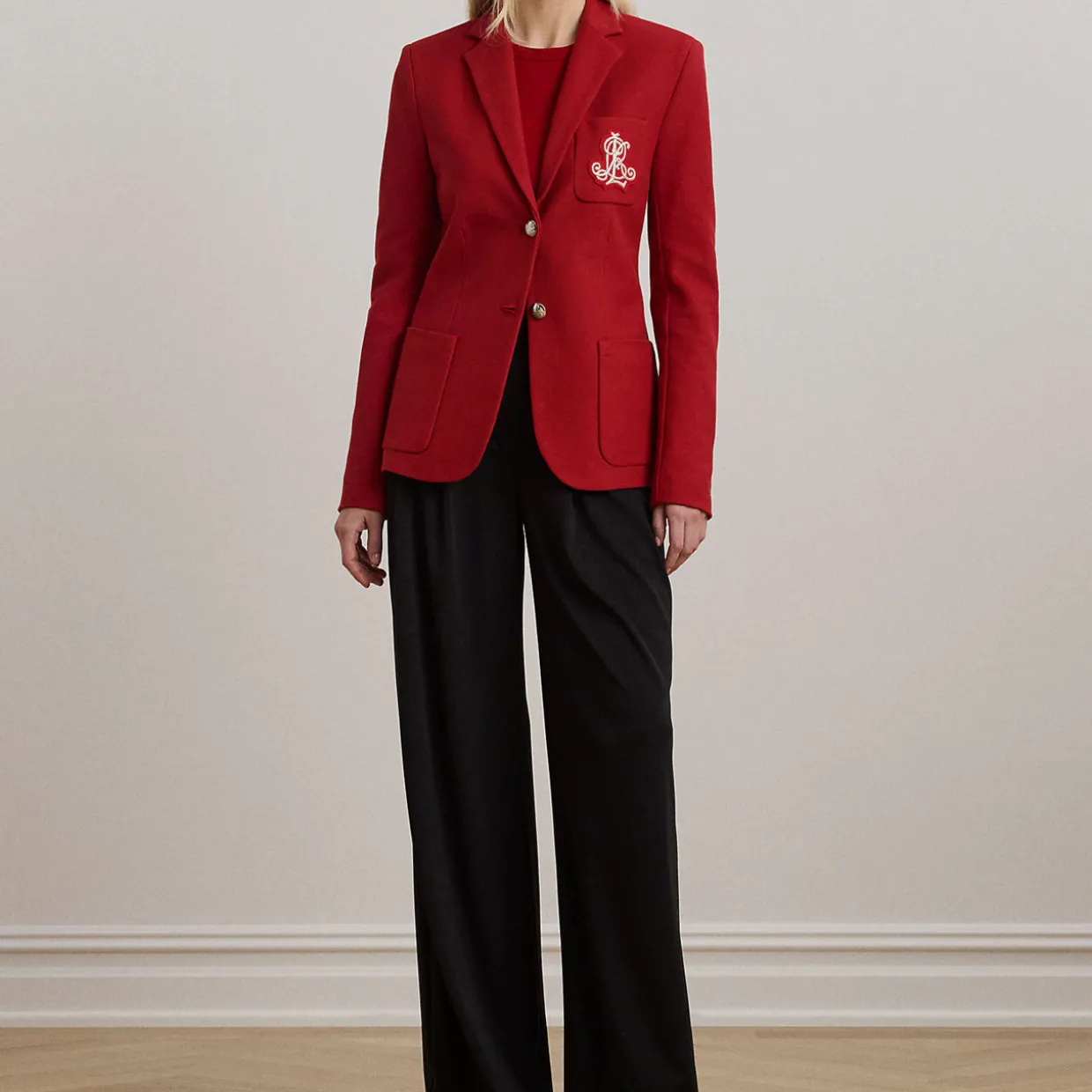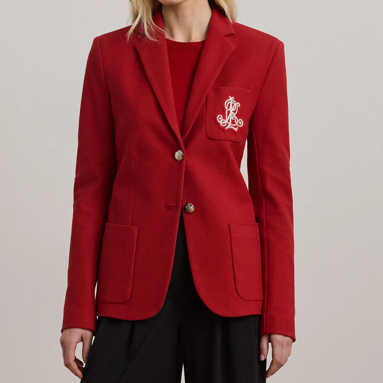 - Notch lapels, two-button silhouette, long sleeves with four-button cuffs, left chest patch pocket, two front waist patch pockets, crest-embossed buttons, bullion logo patch embroidered at the left chest, fully lined