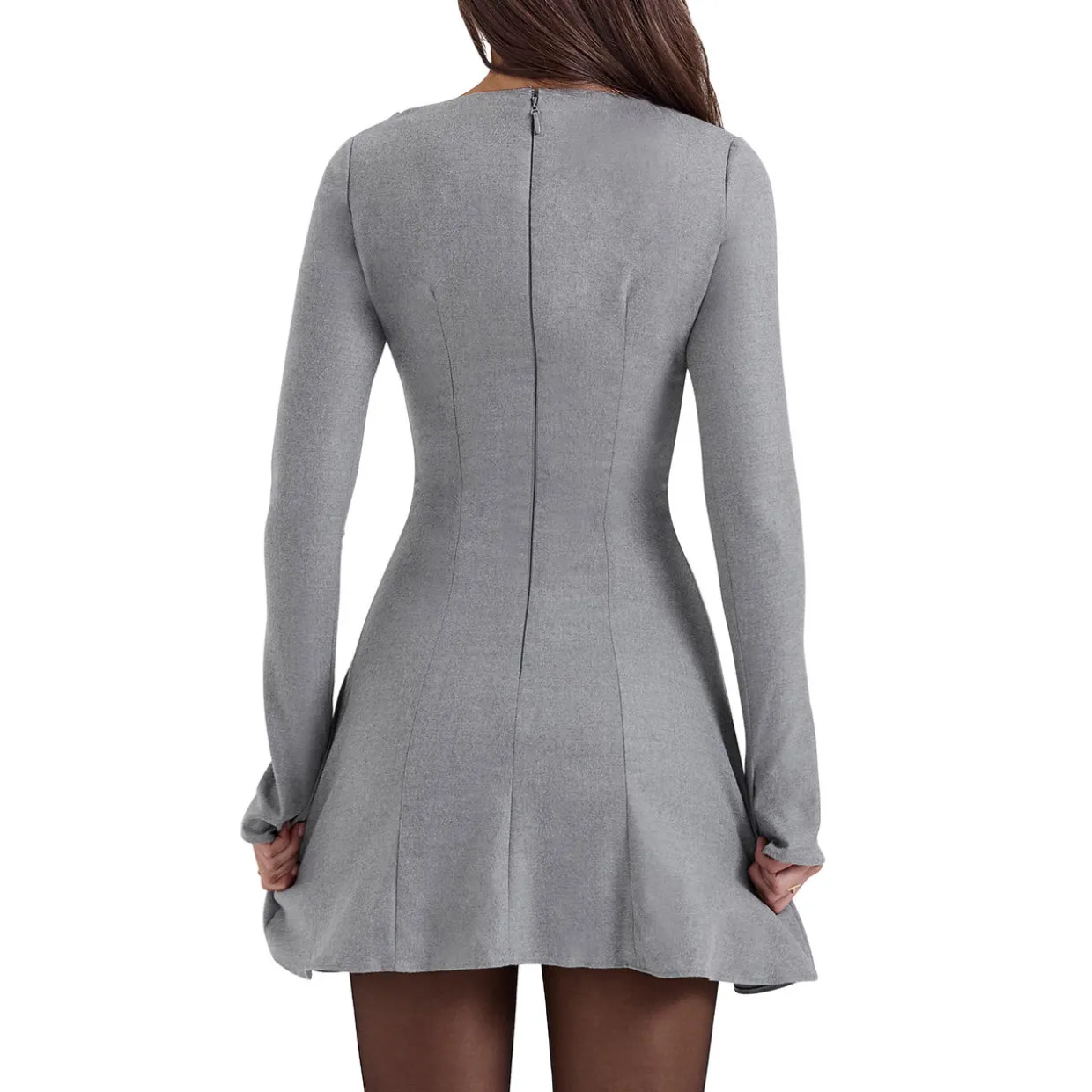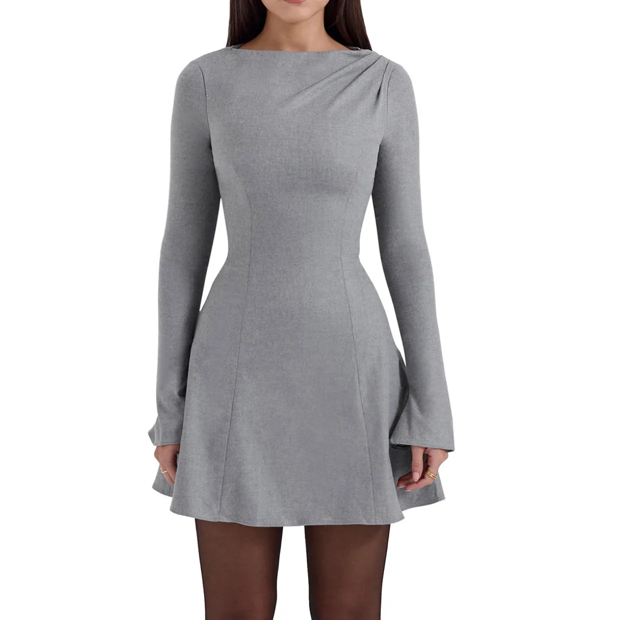 - Boat neckline, flared long sleeves, draped shoulder detail, flared skirt, mini length, zip fastening