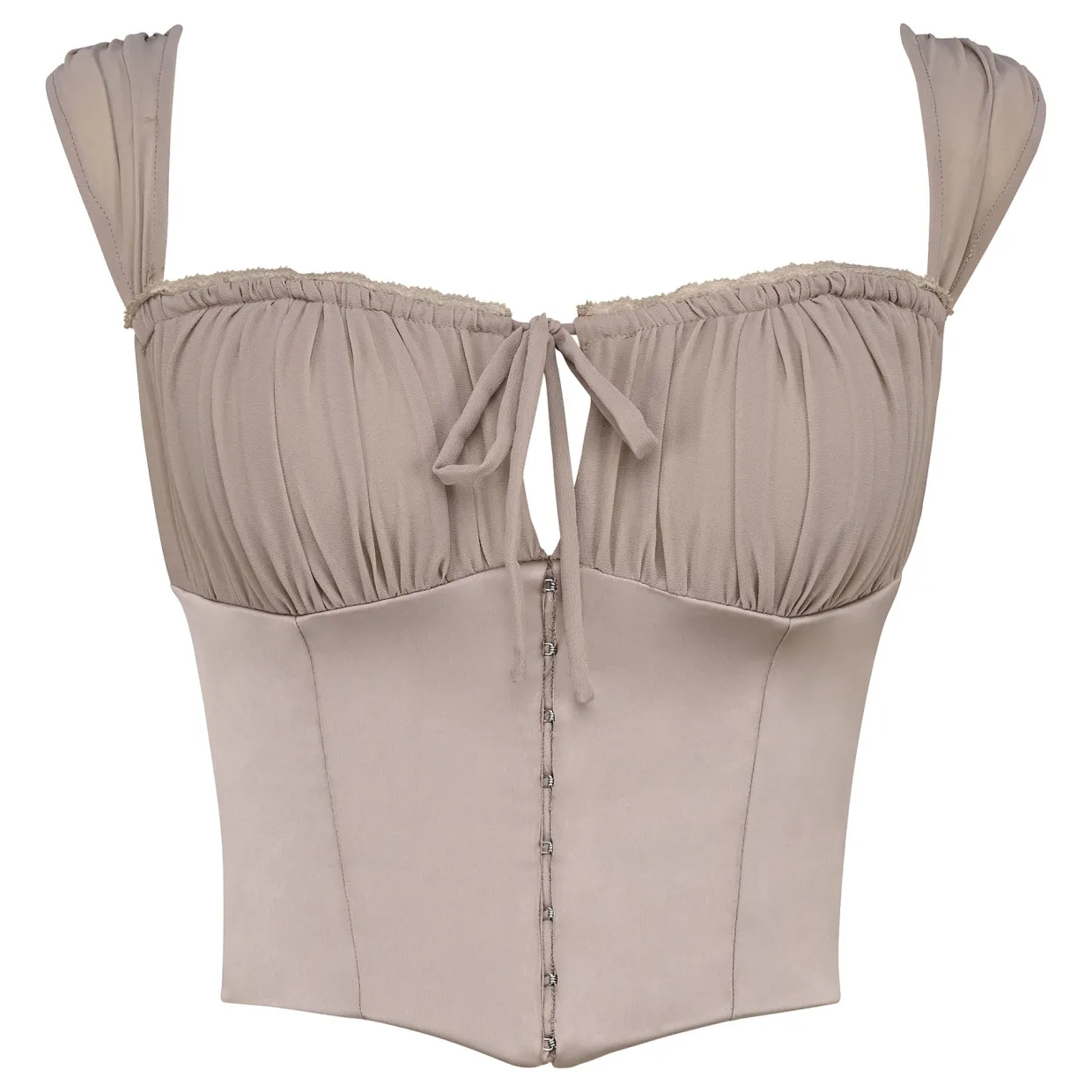 - Satin waist panel with ruched georgette bust, tie front, soft cap sleeves, hook and eye front closures, zip fastening at back, flattering sculpted fit