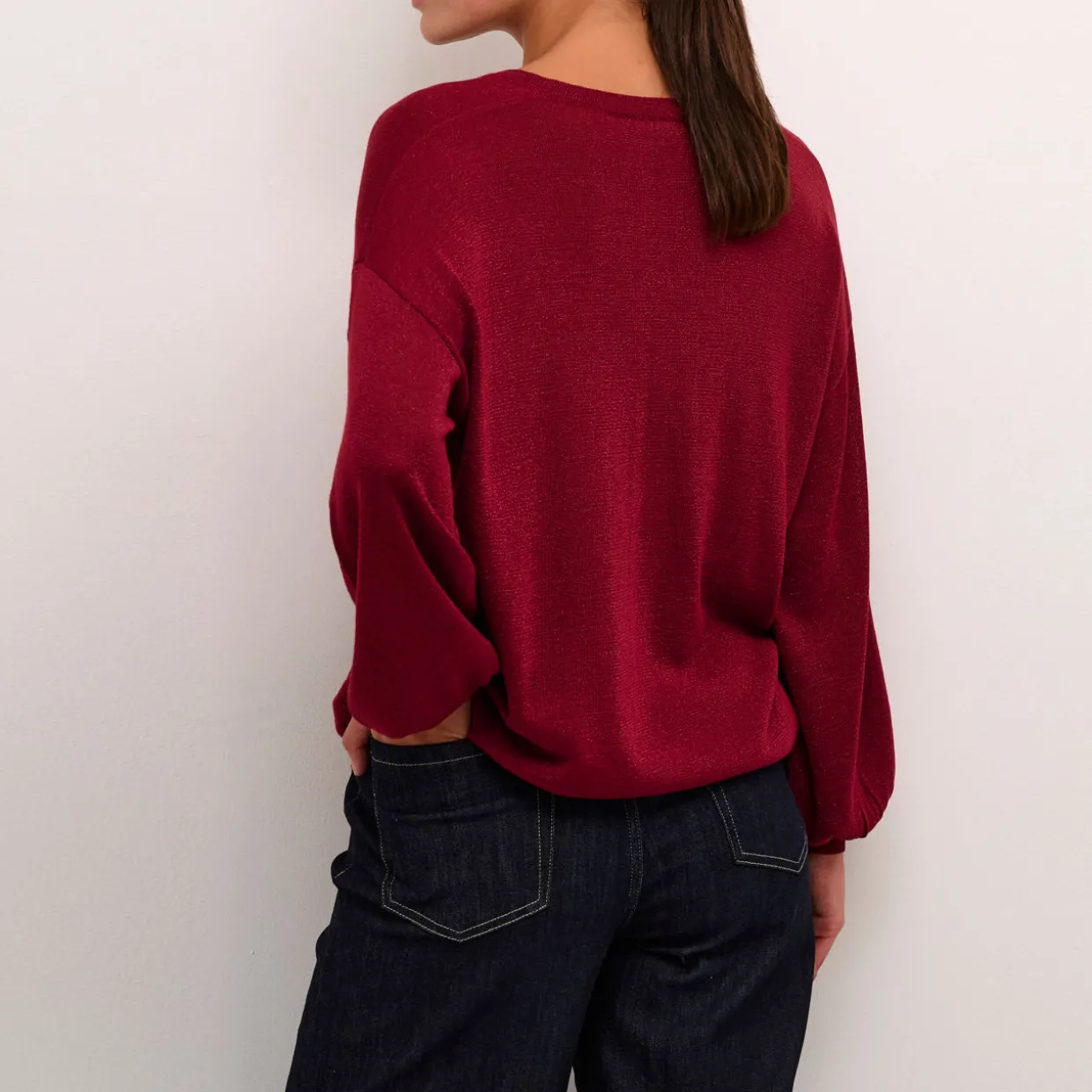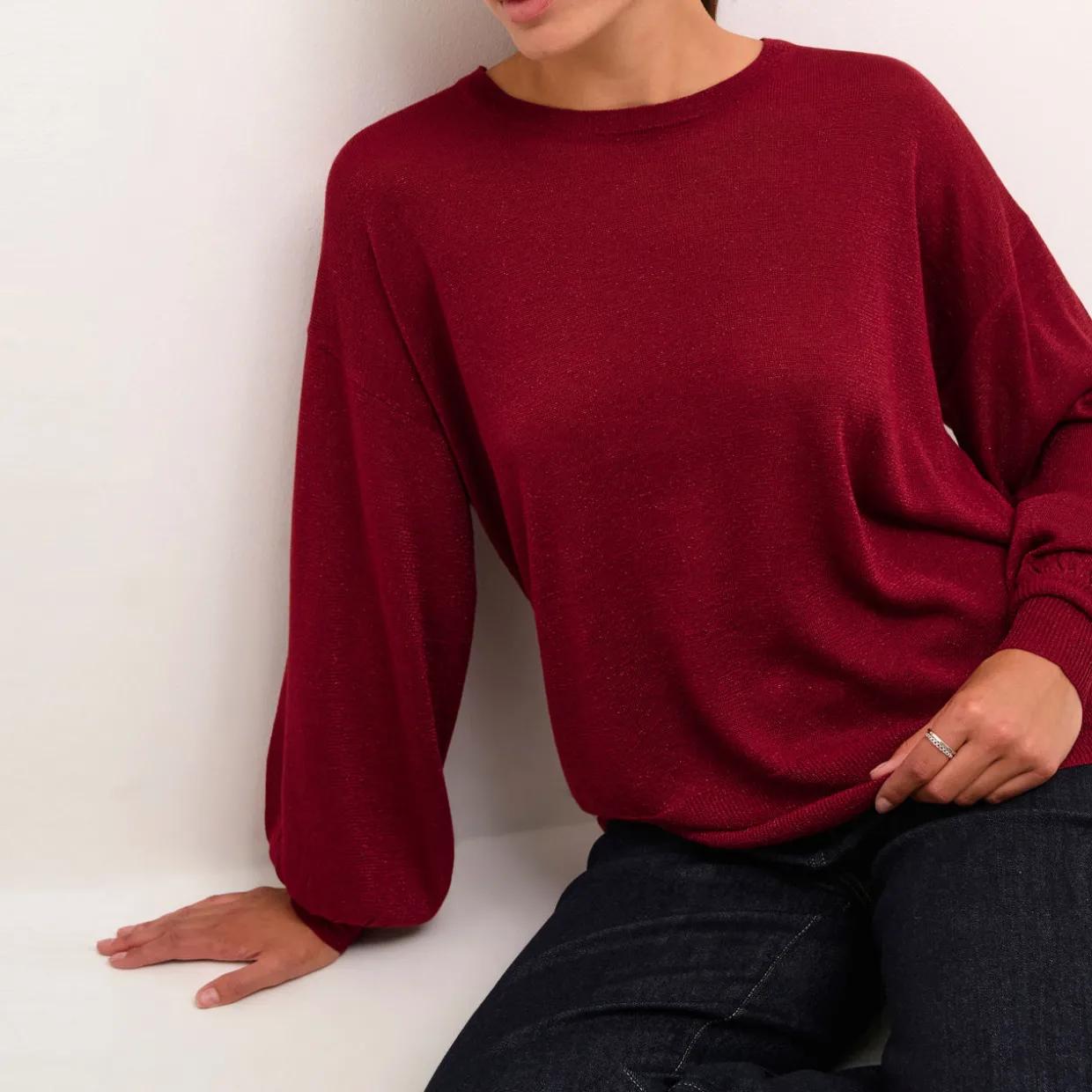 - Round neckline, dropped shoulders, knit structure, long balloon-style sleeves, fitted cuffs, straight hemline