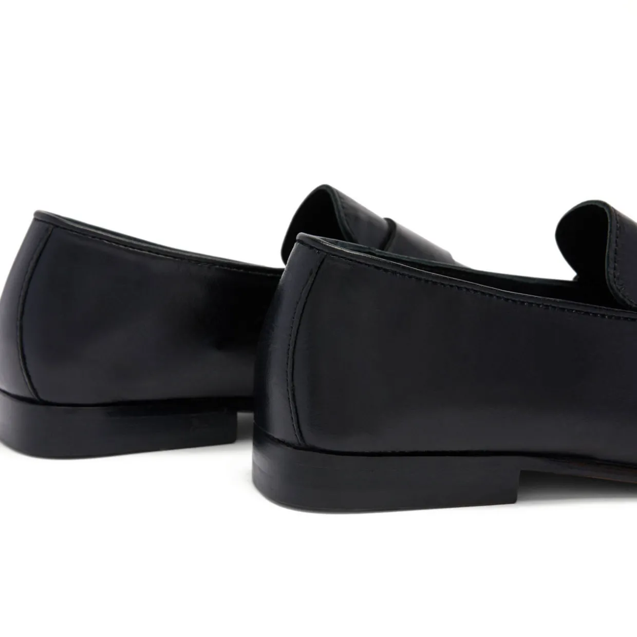 - High-shine leather, ruched stitching, smooth saddle detail, leather sole