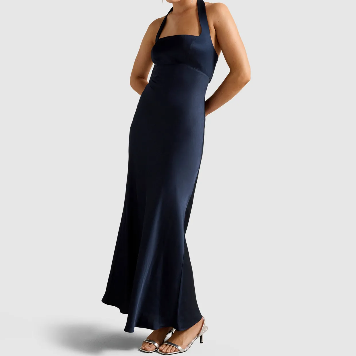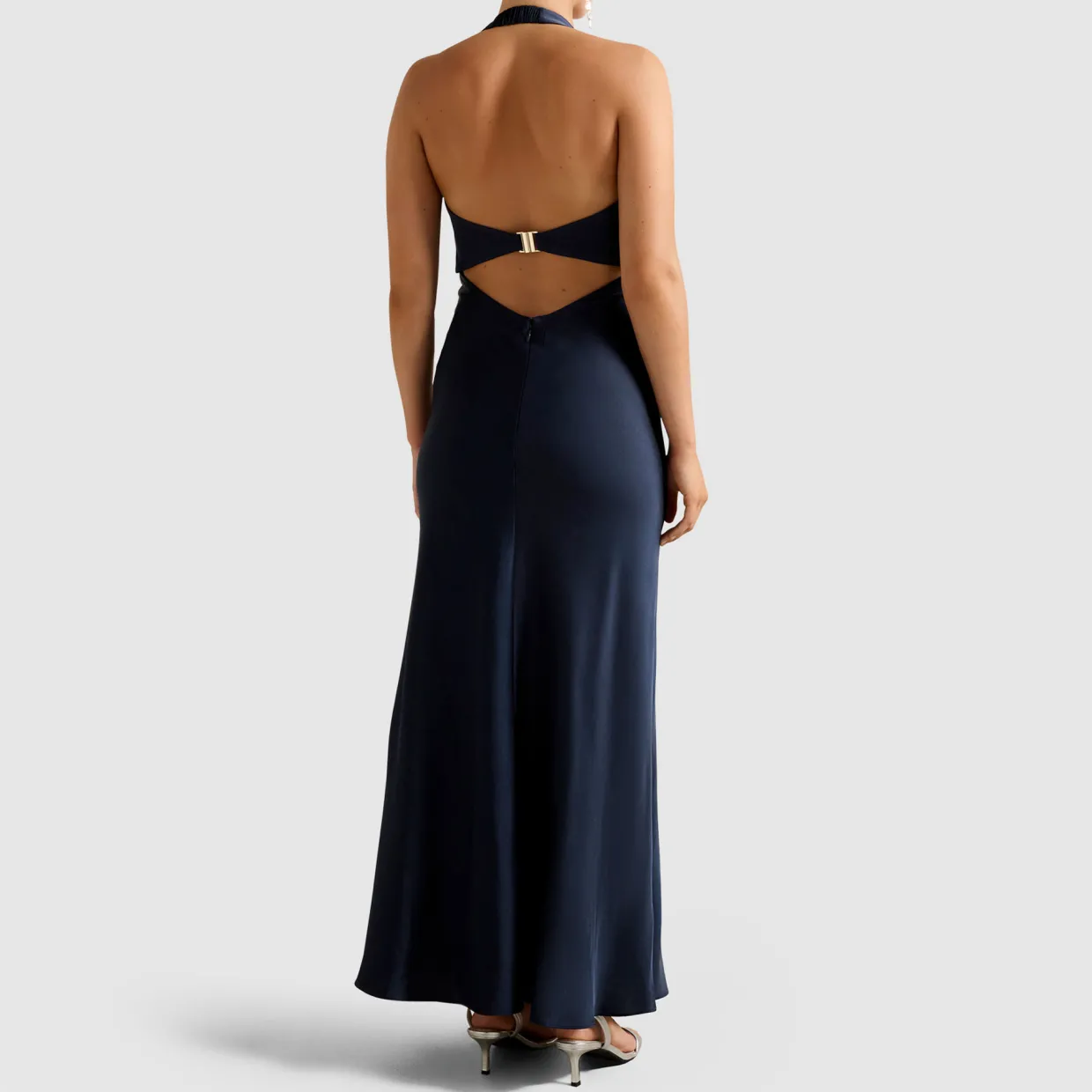 - Open back, maxi length, smooth satin fabrication, halter neckline, back zip closure