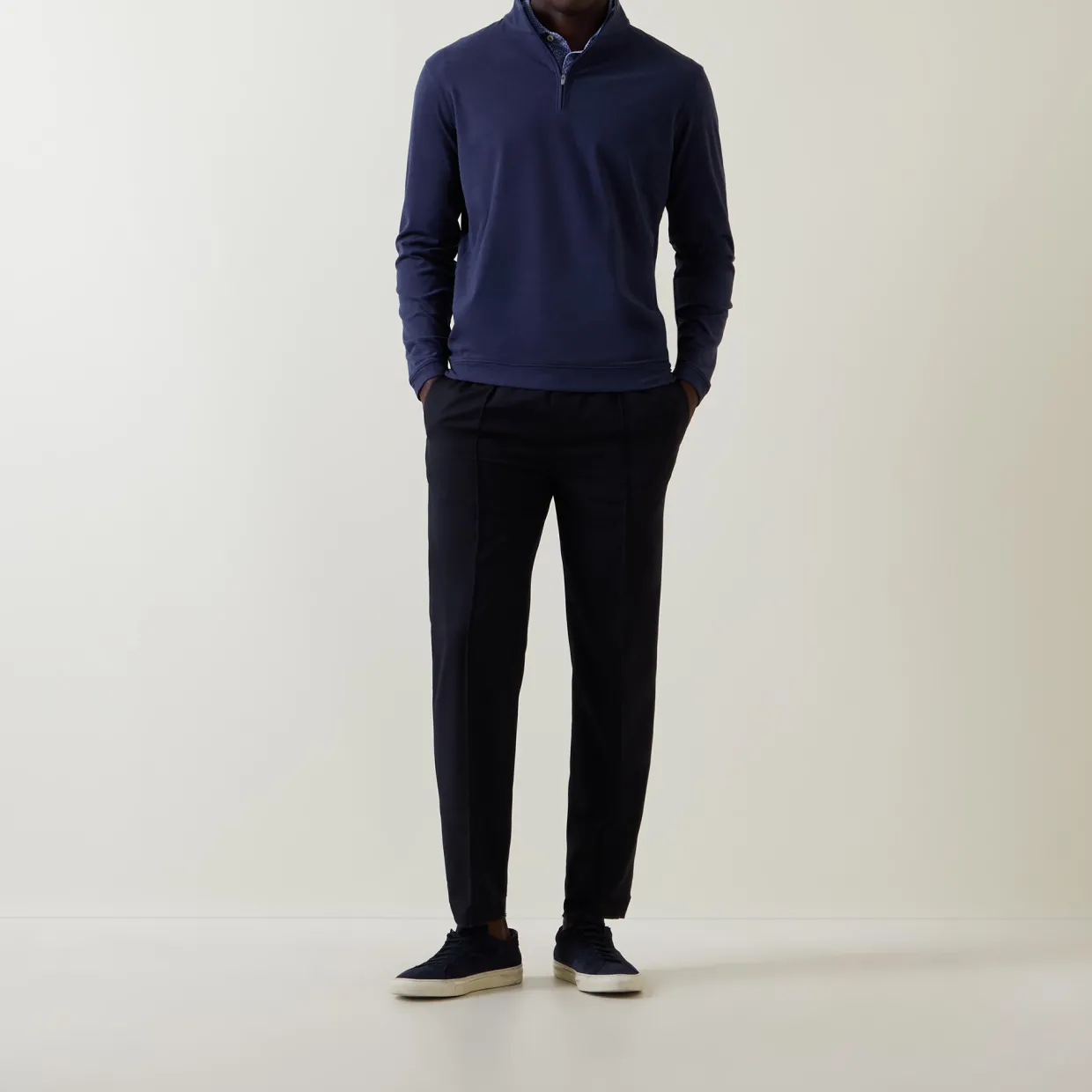 - Stand-up collar, long sleeves, four-way stretch, sweat-wicking, quarter zip-fastening placket, rear logo tag, tonal stitching, pullover style, smooth fabric