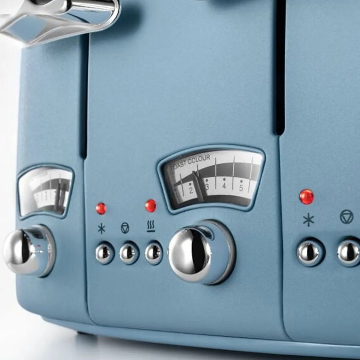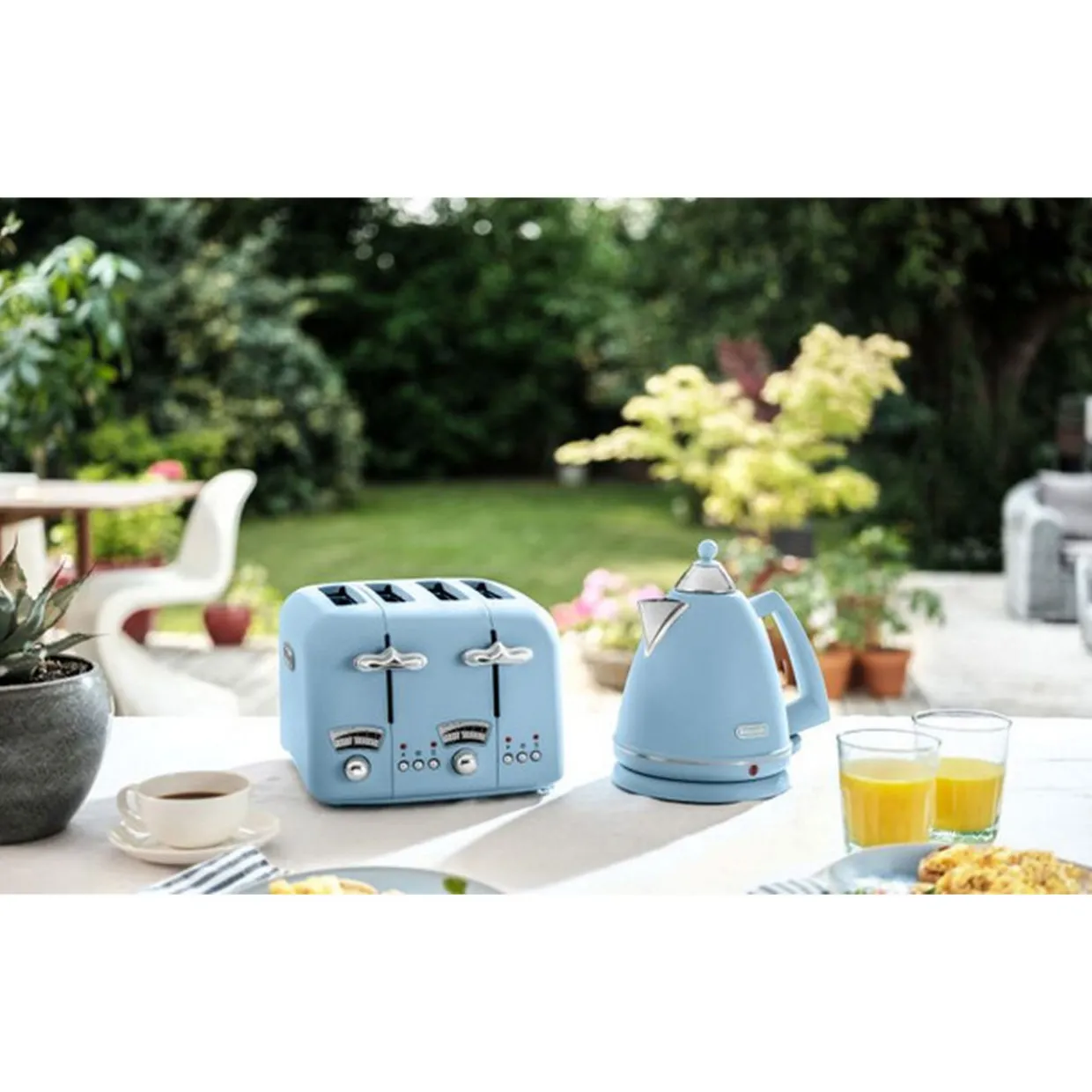 Perfect your morning toast with this Argento Four Slice Toaster from De’Longhi. In cornflower blue, it offers four slots as well as browning control, variable width slots and a self-centring feature to ensure an even finish. With a frozen bread setting and reheat button, this toaster will cater for the preferences of every family member and all guests. The perfect choice when paired with the matching kettle to add some colour to your kitchen counters.