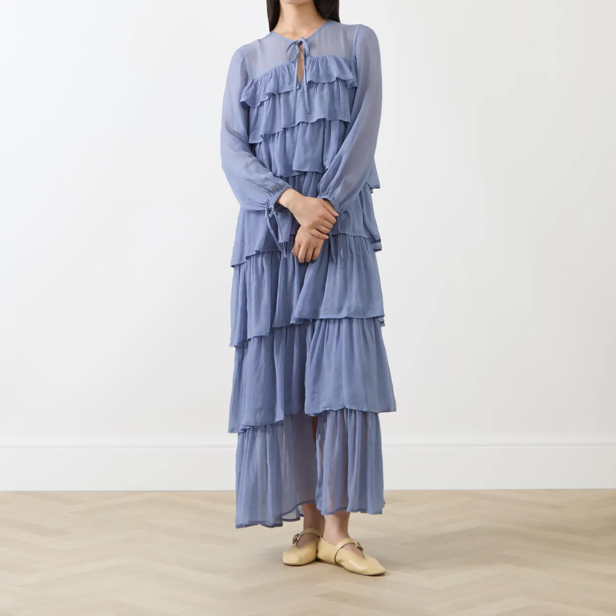 - Round neck, long sleeves, tie fastenings, ruffle detailing throughout, full tiered skirt, lightweight, semi-sheer, midi length