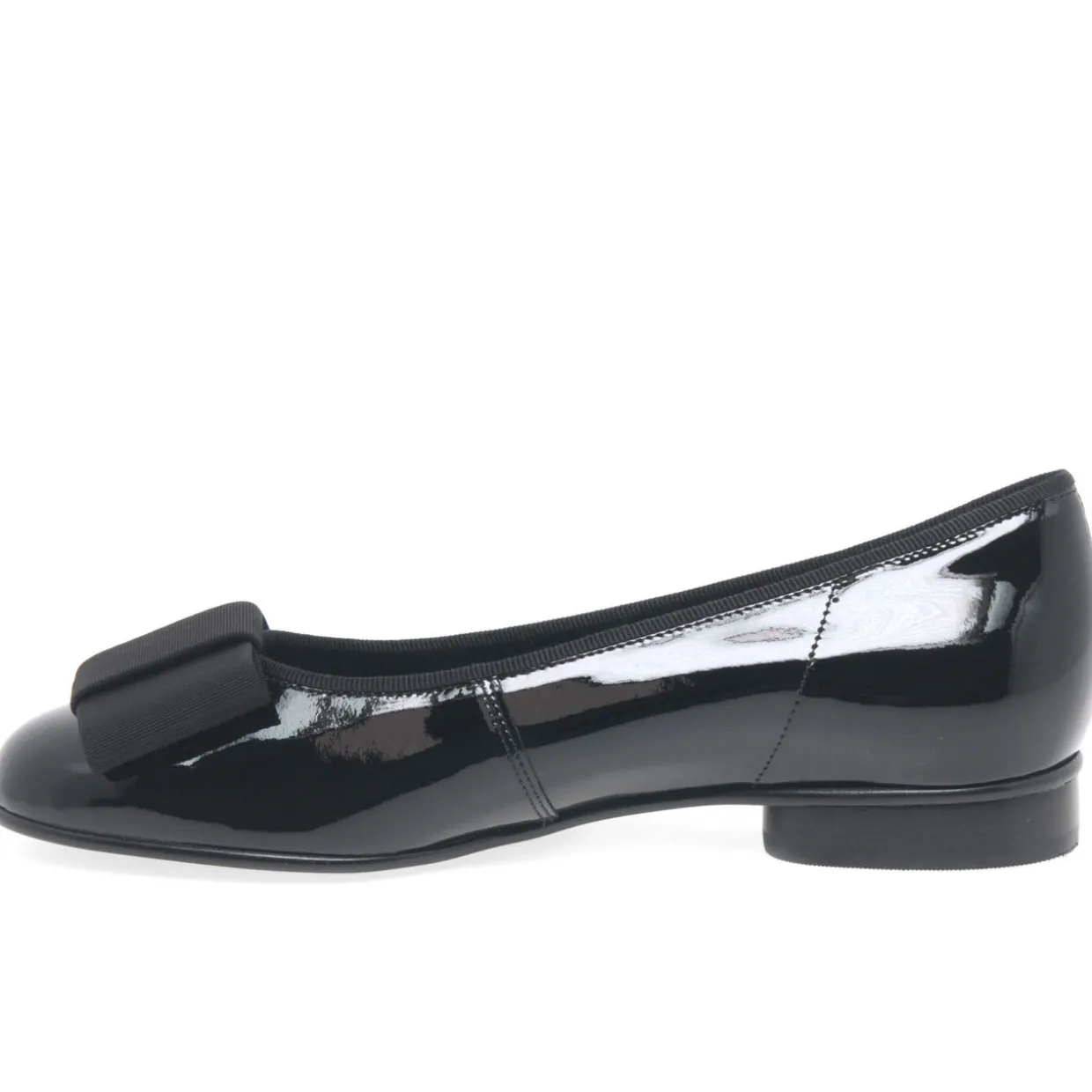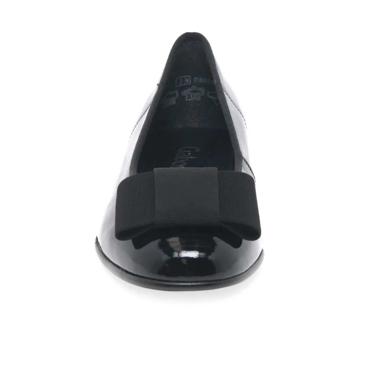 - Round toe, low heel, slip-on style, patent finish, wide bow detail