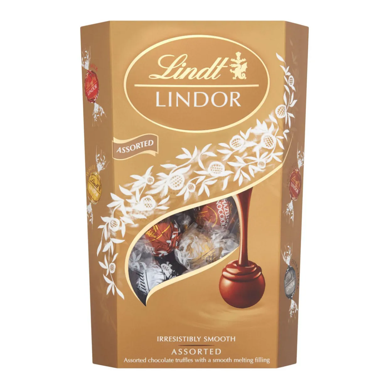 - Milk, milk with hazelnut pieces, white and extra dark chocolate truffles with a smooth melting filling