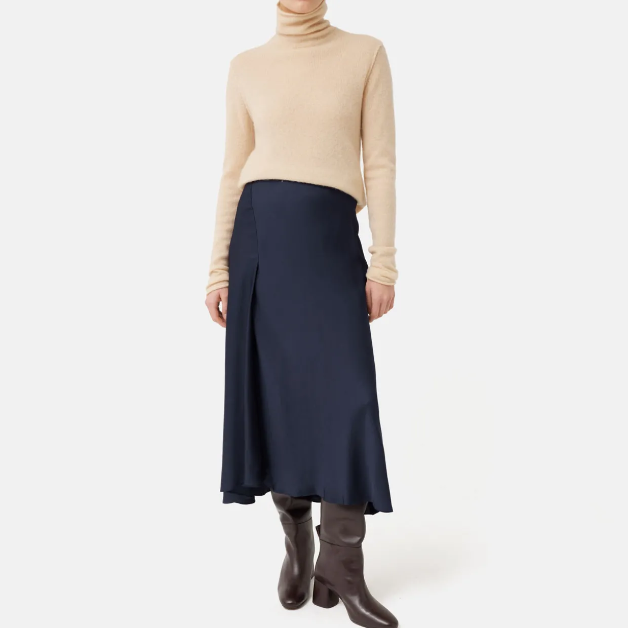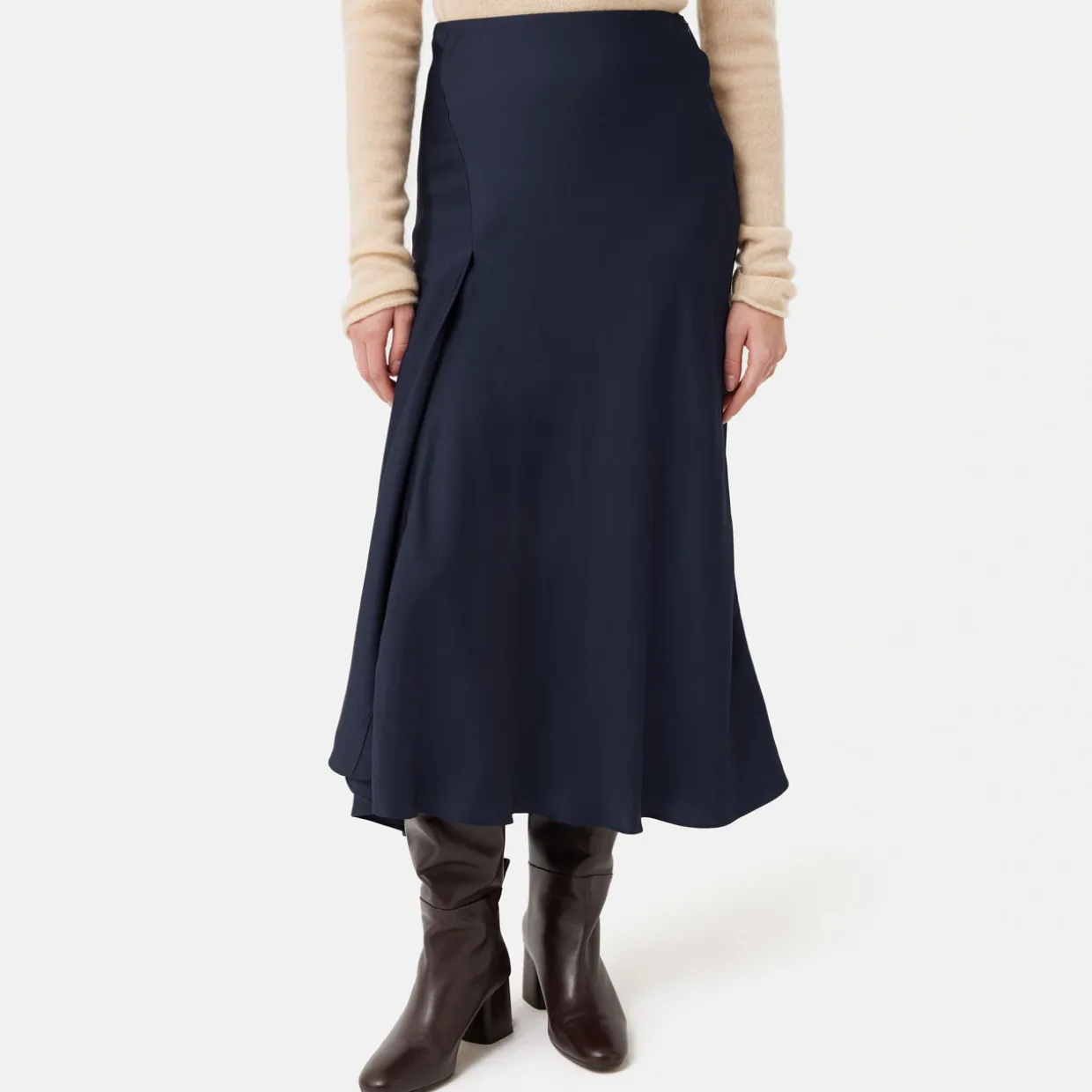 - Satin back crepe fabric, asymmetric hemline, bias cut, full skirt, internal elasticated waistband, invisible side zip fastening, midi length