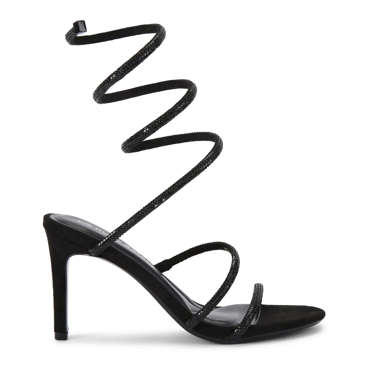 - Crystal embellishment, spiral ankle strap, high stiletto style