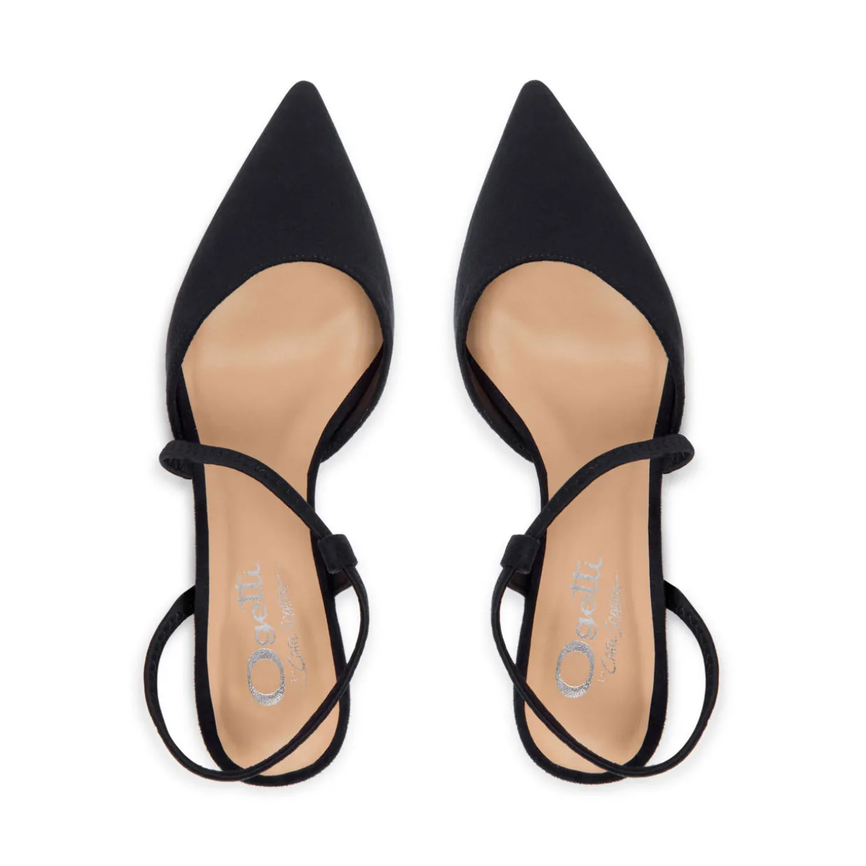 - Faux-suede upper, slingback silhouette, pointed toe, mid stiletto heel, asymmetrical elasticated strap, court silhouette, leather sock lining, cushioned insole