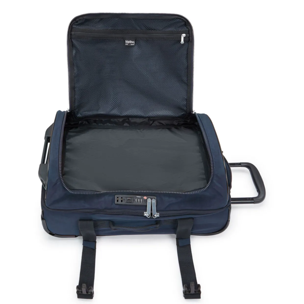 - Features: Exterior: Two wheeled luggage, adjustable straps, double handle bar, extra straps, easy access side pocket, double safe TSA lock, round Kipling logo. Interior: Two zipped main compartments