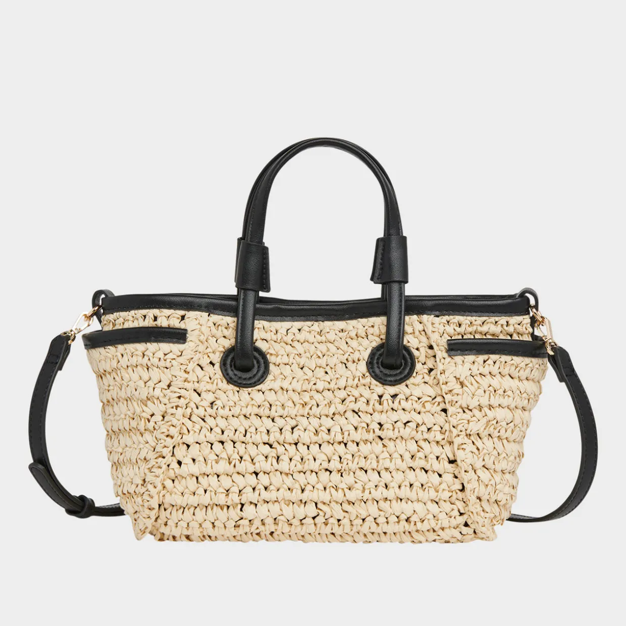 - Two top carry handles, detachable/adjustable strap, two outer side pockets, contrasting trim detailing, textured woven finish