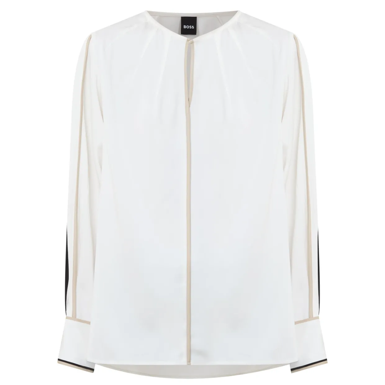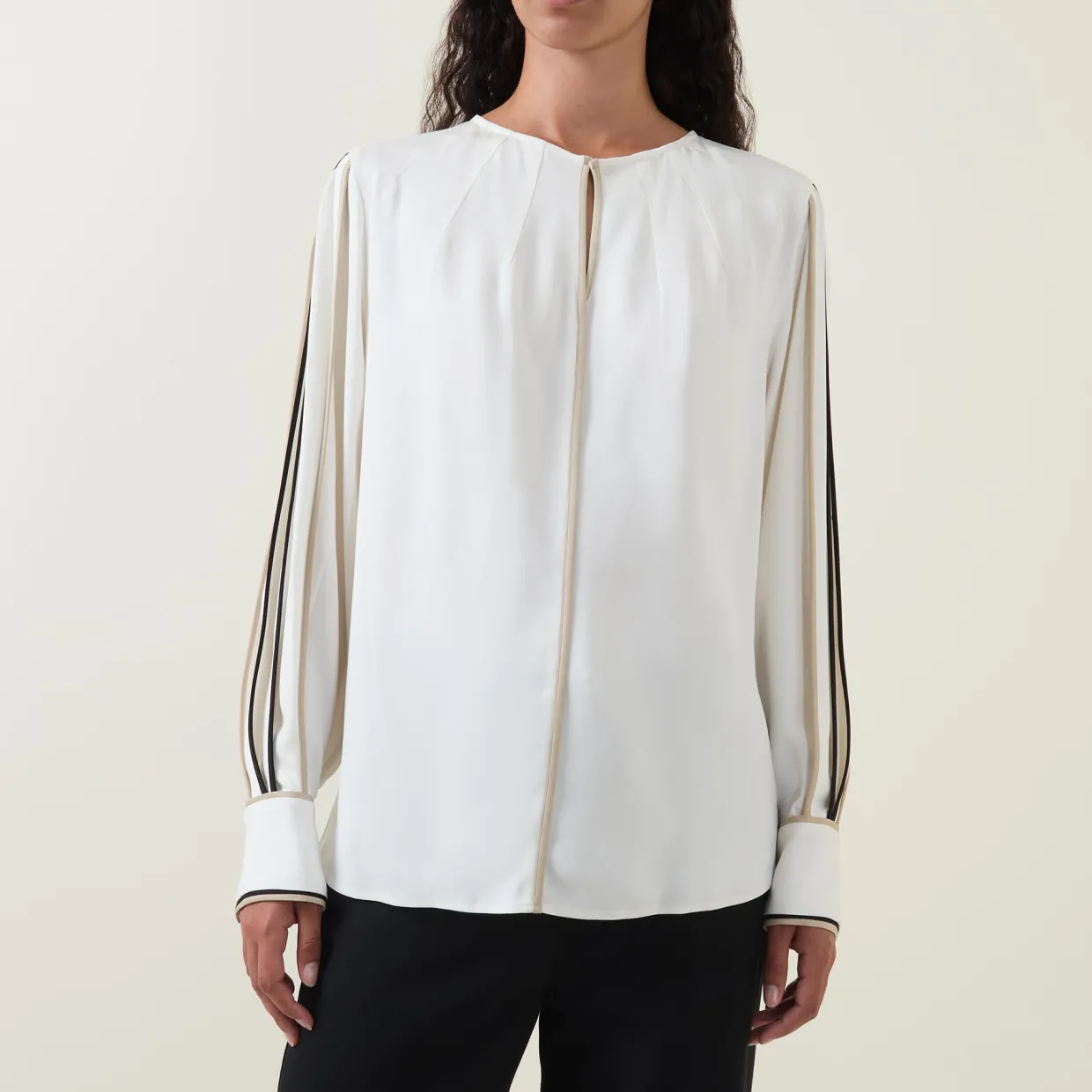 - Round neckline, long blouson sleeves with logo stripe detailing, front keyhole detail, tonal stitching, smooth fabric