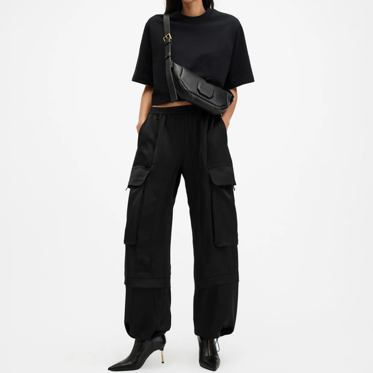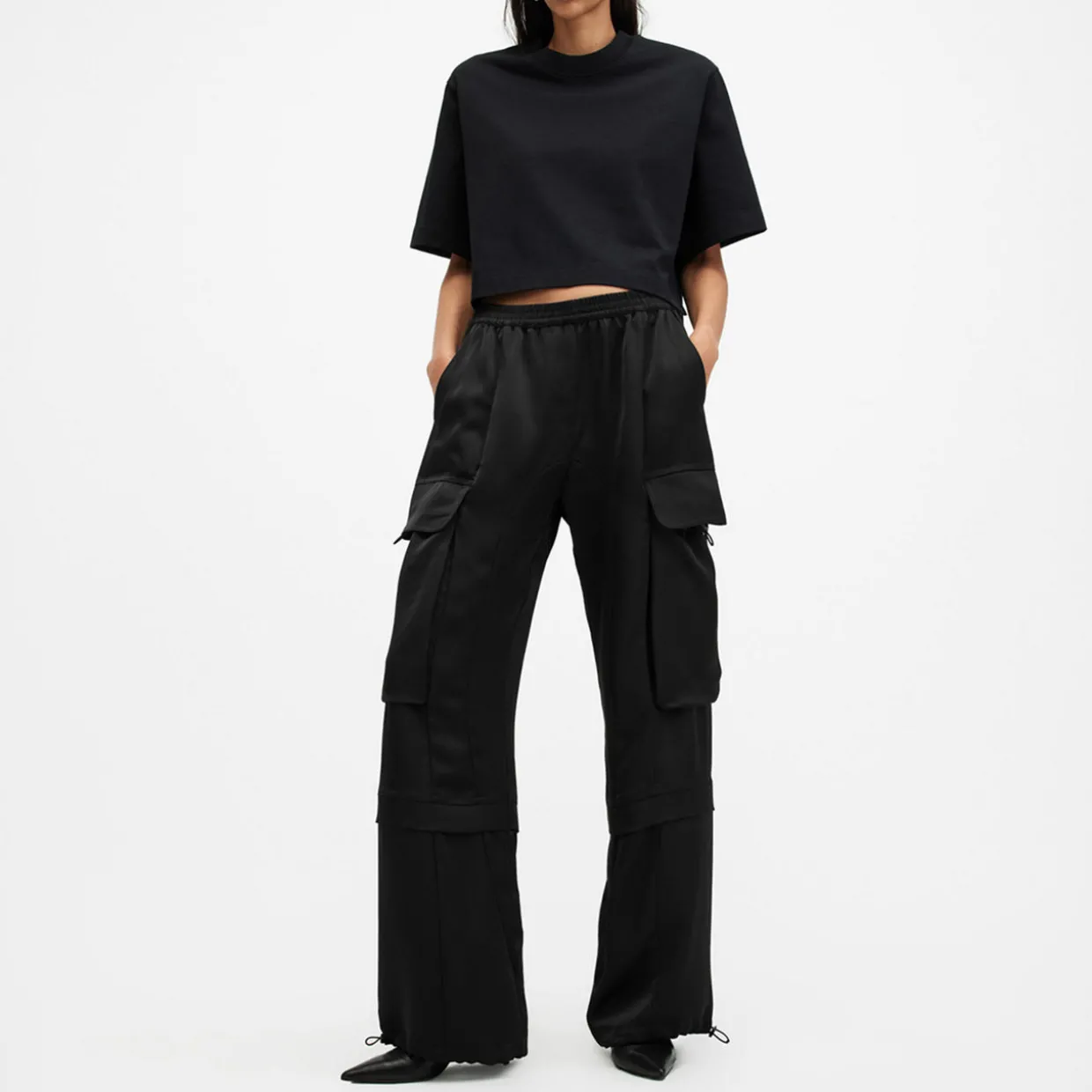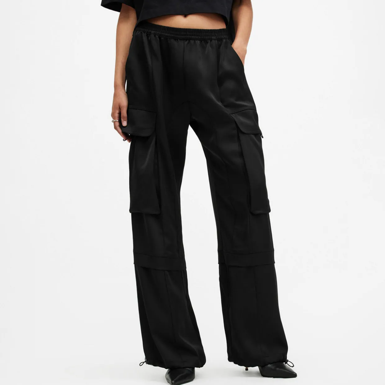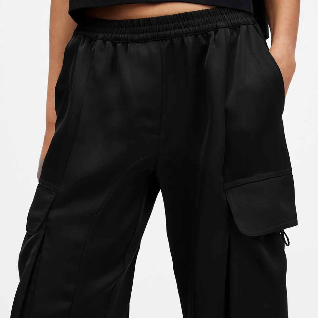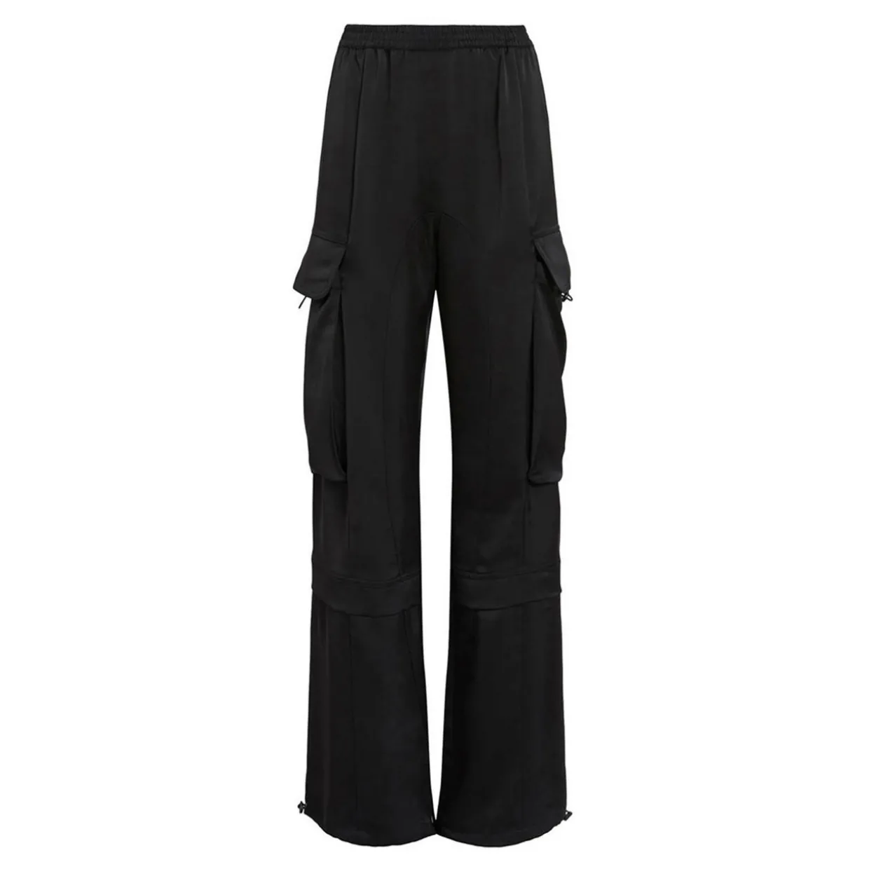 - Zip closure, button fastening, elasticated waistband, slit pockets, flap cargo pockets on each side of leg, adjustable drawcord cuffs