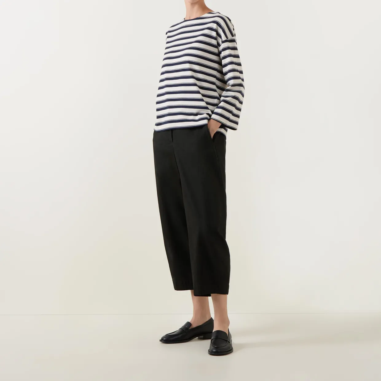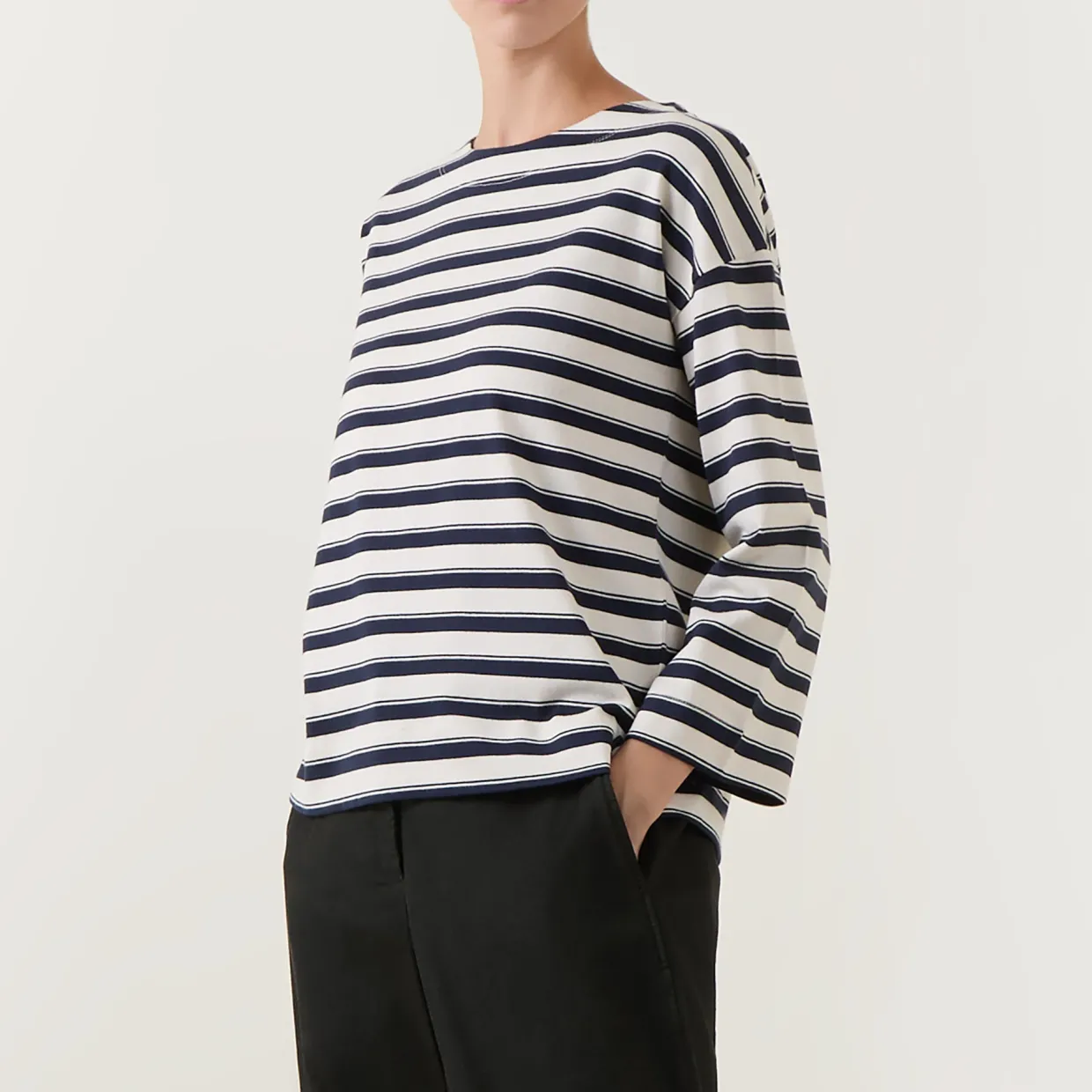 - Round neckline, long sleeves, dropped shoulders, all-over striped pattern, smooth jersey fabric