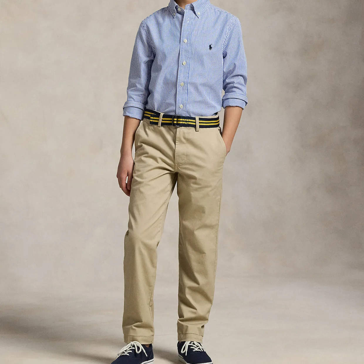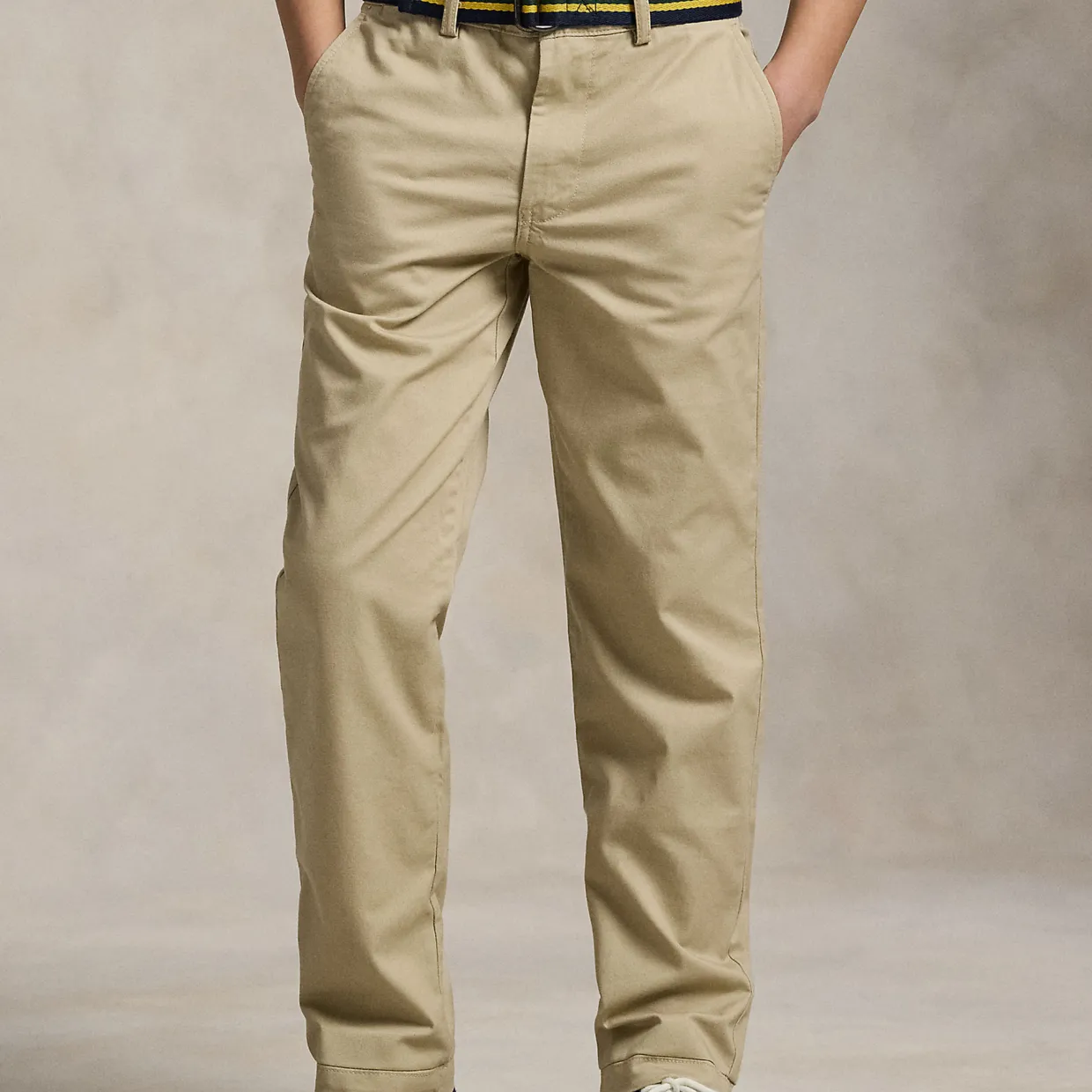 - Slim fit, belted, side pockets, pony logo, wrinkle-resistant technology.