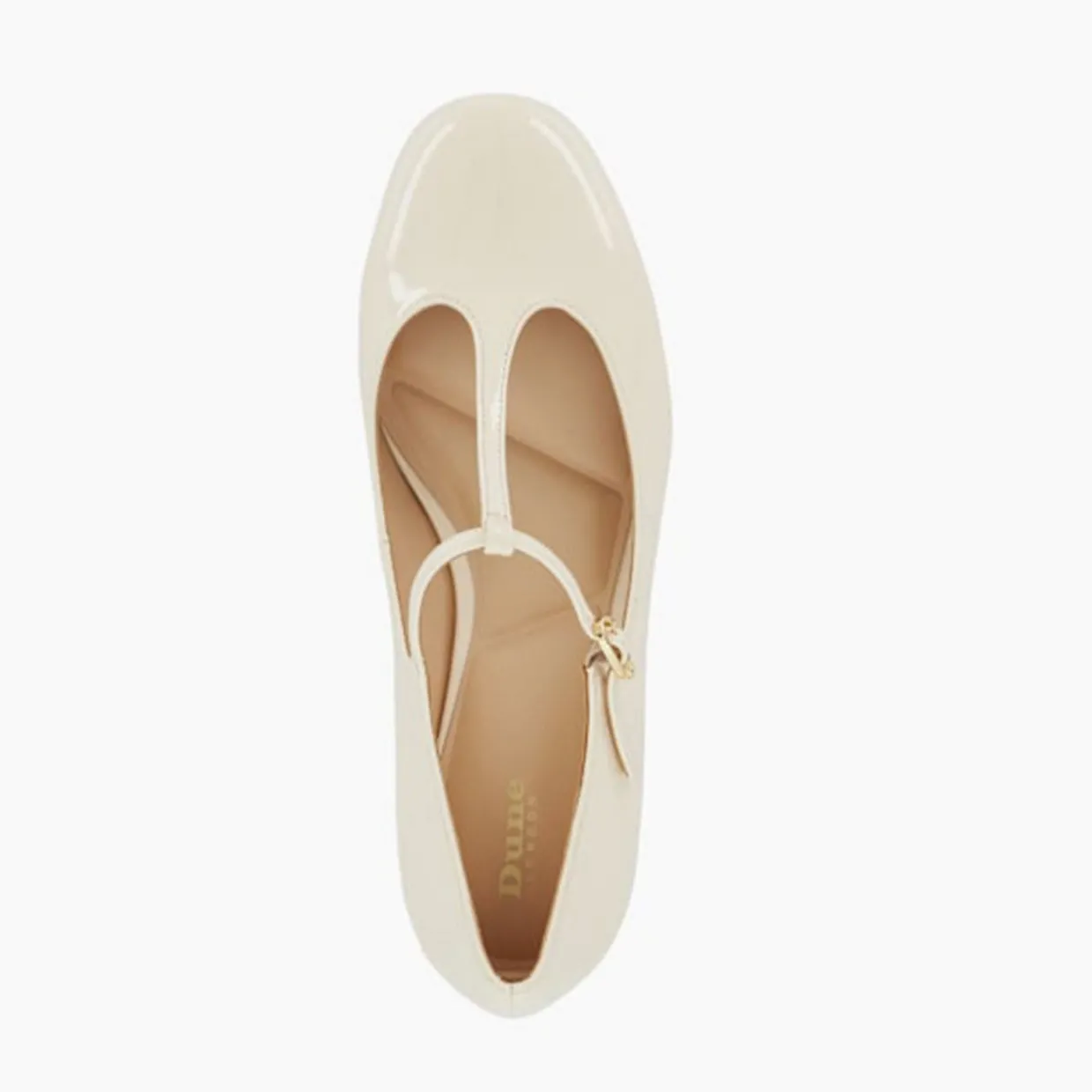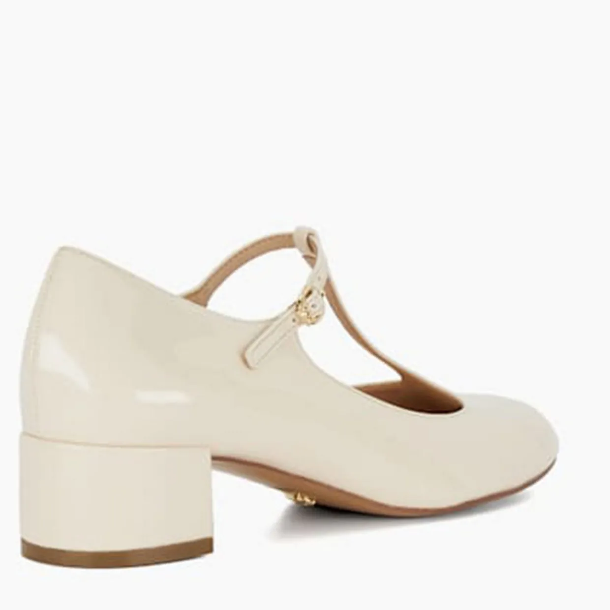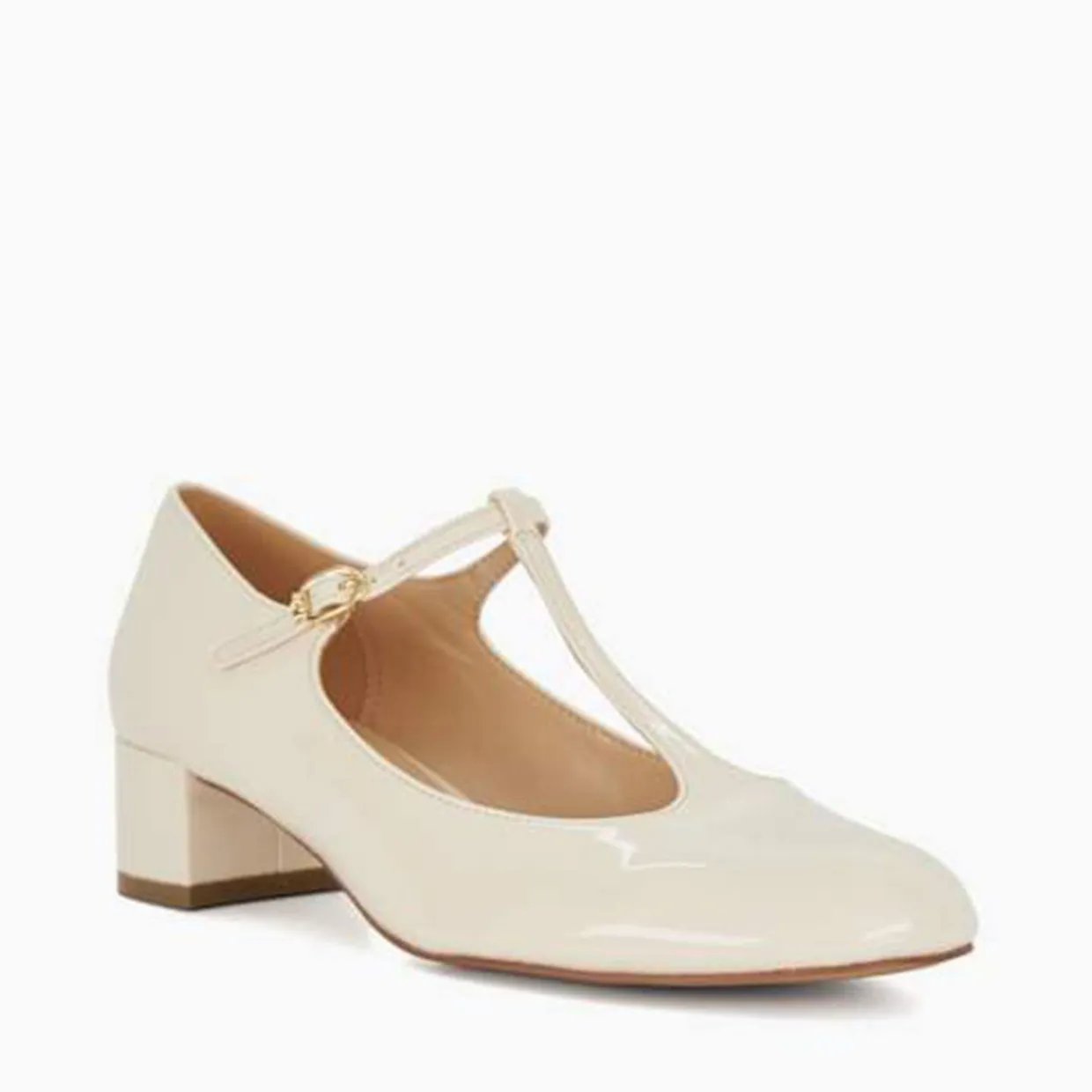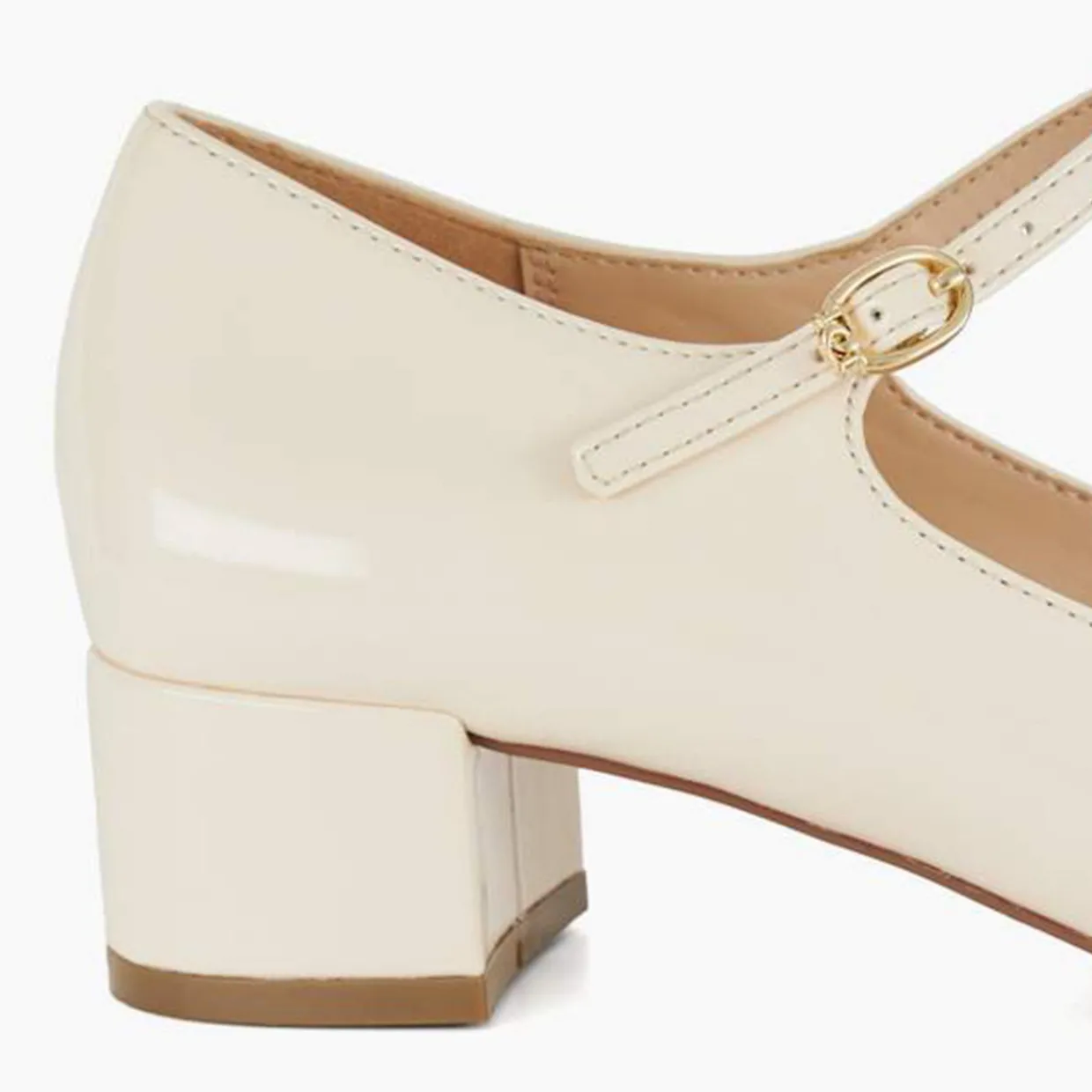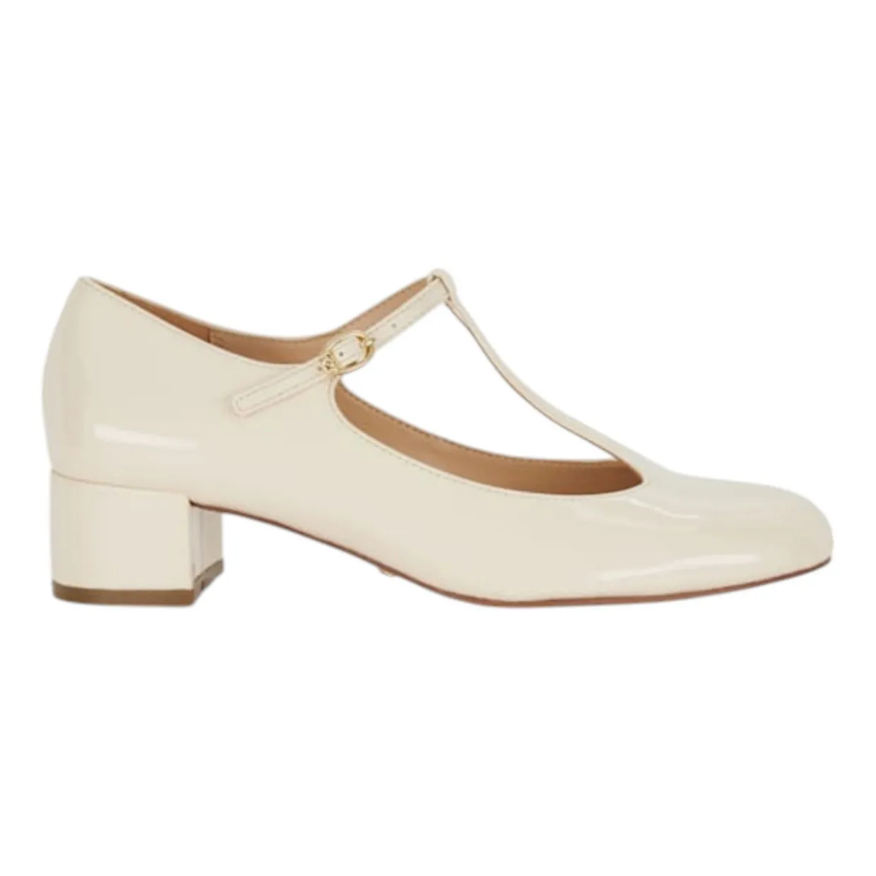 - Low block heel, patent finish, Mary Jane silhouette, skinny strap, metal side buckle, almond-toed design