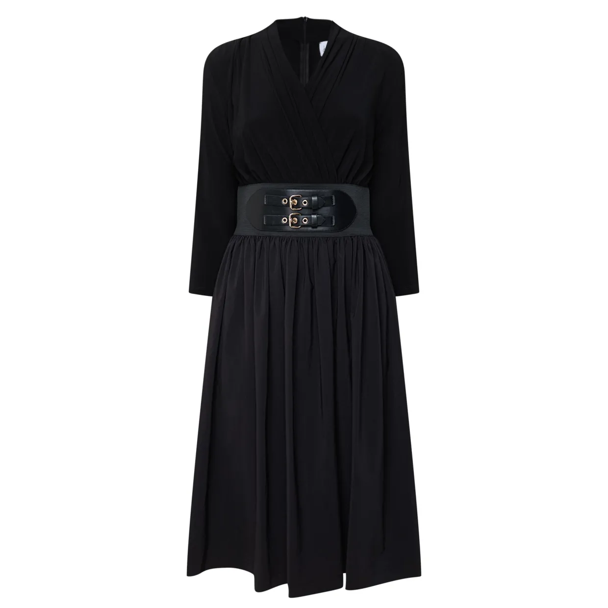 - Wrap-style bodice, V-neckline, three-quarter length sleeves, rear zip fastening, fitted through the waist, integrated belt with rear elasticated design and buckle detail, full flared skirt, straight hem, midi length, smooth finish